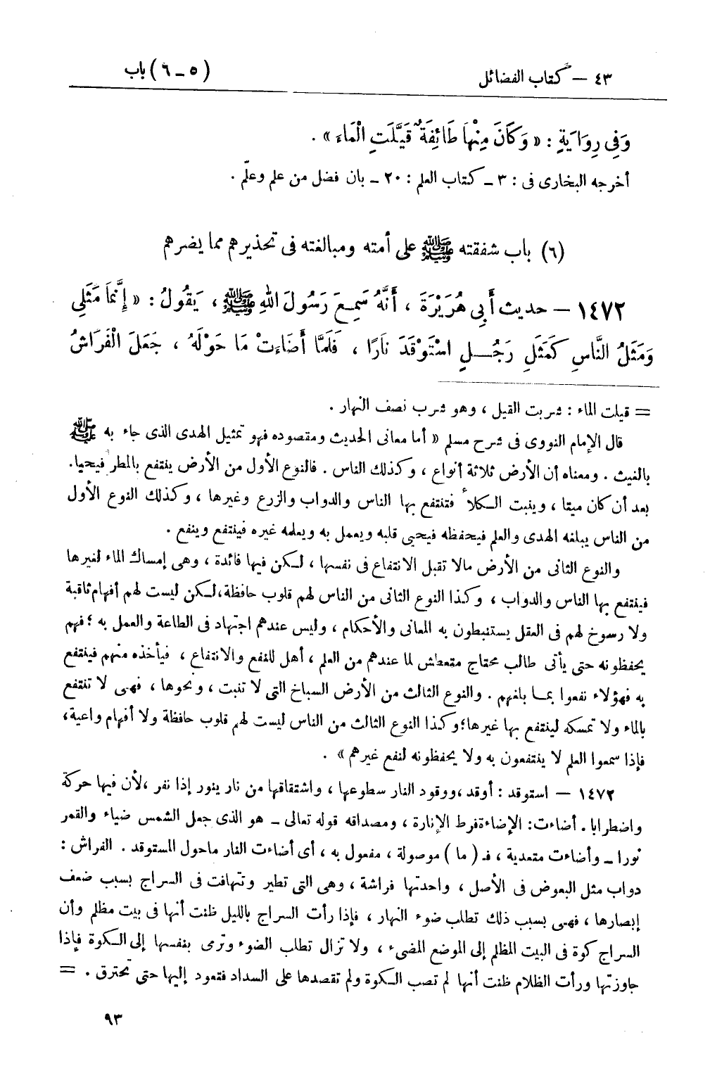 1472 - حديث أَبِي هُرَيْرَةَ، أَنَّهُ سَمِعَ رَسُولَ اللهِ صَلَّى اللَّهُ عَلَيْهِ وَسَلَّمَ، يَقُولُ: إِنَّمَا مَثَلِي وَمَثَلُ النَّاسِ كَمَثَلِ رَجُلٍ اسْتَوْقَدَ نَارًا، فَلَمَّا أَضَاءَتْ مَا حَوْلَهُ، جَعَلَ الْفَرَاشُ -[94]- وَهذِهِ الدَّوَابُّ الَّتِي تَقَعُ فِي النَّارِ يَقَعْنَ فِيهَا، فَجَعَلَ يَنْزِعُهُنَّ وَيَغْلِبُنَهُ، فَيَقْتَحِمنَ فِيهَا فَأَنَا آخُذُ بِحُجَزِكُمْ عَنِ النَّارِ وَهُمْ يَقْتَحِمُونَ فِيهَا