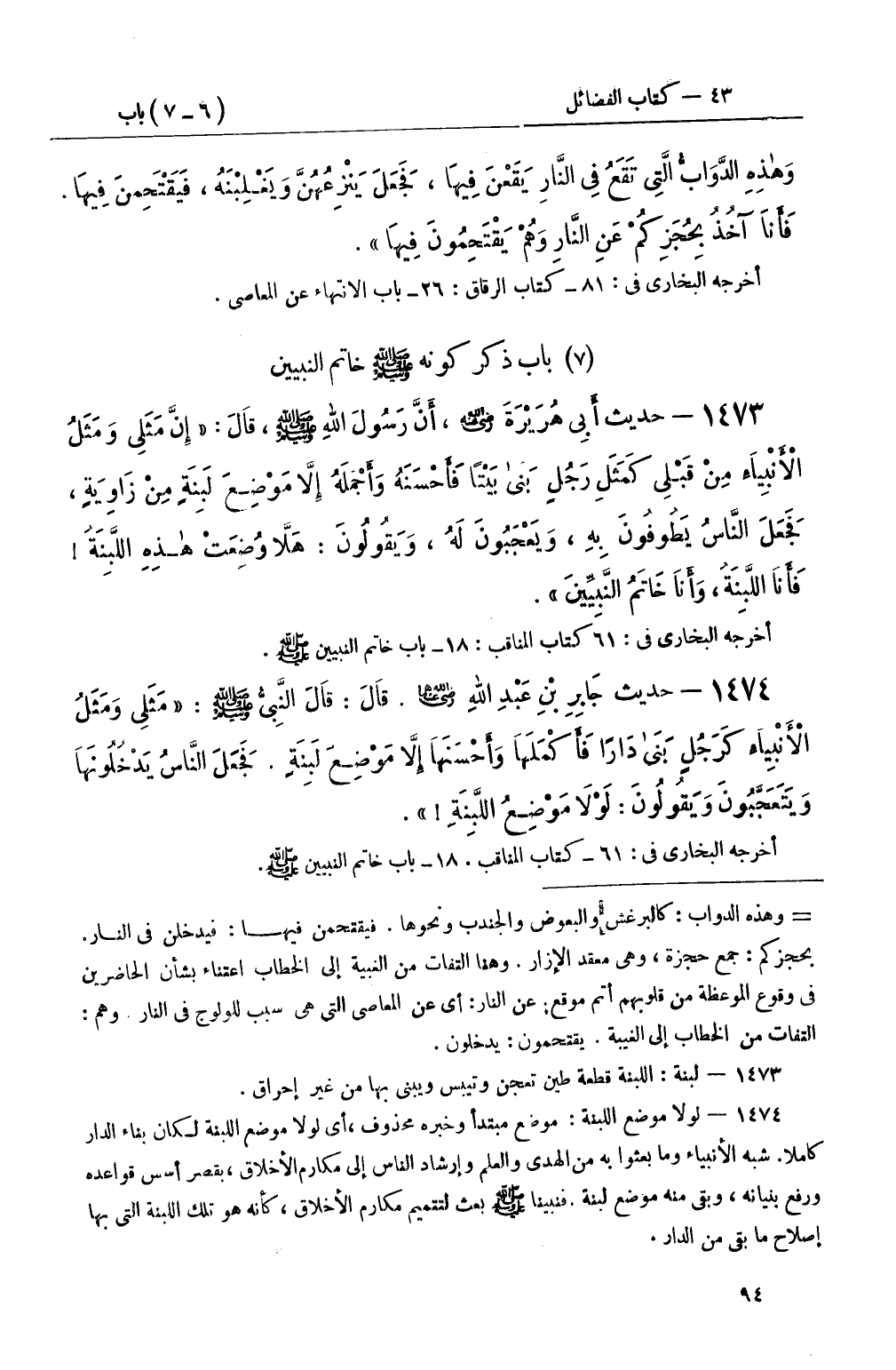 1473 - حديث أَبِي هُرَيْرَةَ رضي الله عنه، أَنَّ رَسُولَ اللهِ صَلَّى اللَّهُ عَلَيْهِ وَسَلَّمَ، قَالَ: إِنَّ مَثَلِي وَمَثَلُ الأَنْبِيَاءِ مِنْ قَبْلِي كَمَثَلِ رَجُلٍ بَنى بَيْتًا فَأَحْسَنَهُ وَأَجْمَلَهُ إِلاَّ مَوْضِعَ لَبِنَةٍ مِنْ زَاوِيَةٍ، فَجَعَلَ النَّاسُ يَطُوفُونَ بِهِ، وَيَعْجَبُونَ لَهُ، وَيَقُولُونَ: هَلاَّ وُضِعَتْ هذِهِ اللَّبِنَةُ فَأَنَا اللَّبِنَةُ، وَأَنَا خَاتَمُ النَّبِيِّينَ
