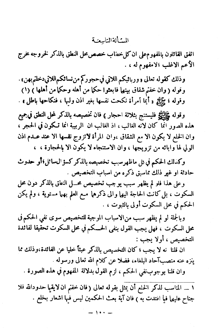 [الْمَسْأَلَةُ التاسعة كُلَّ خِطَابٍ خَصَّصَ مَحَلَّ النُّطْقِ بِالذِّكْرِ لِخُرُوجِهِ مَخْرَجَ الْأَعَمِّ بِالْأَغْلَبِ لَا مَفْهُومَ لَهُ]