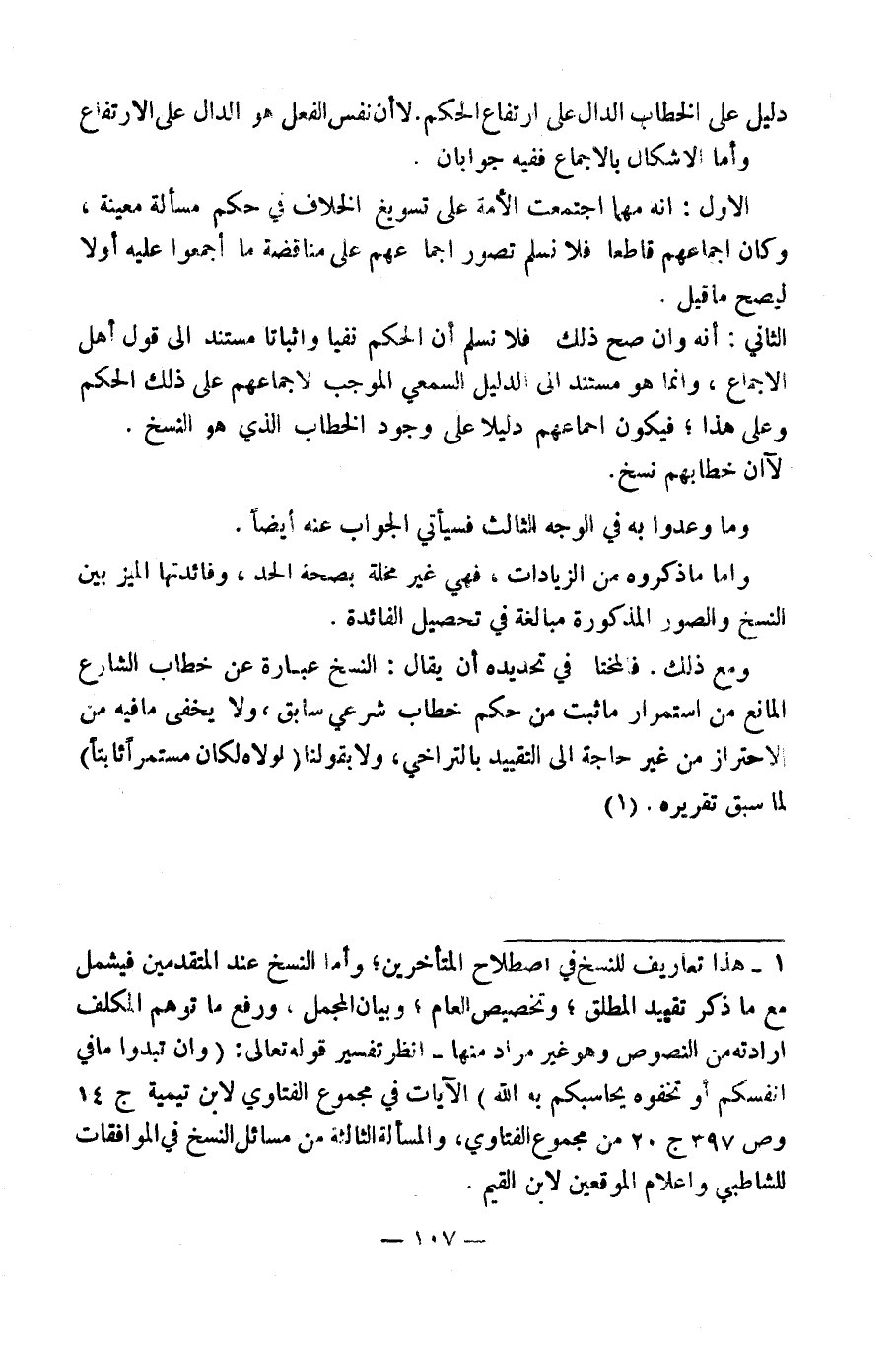 (١) هَذَا تَعْرِيفٌ لِلنَّسْخِ فِي اصْطِلَاحِ الْمُتَأَخِّرِينَ، وَأَمَّا النَّسْخُ عِنْدَ الْمُتَقَدِّمِينَ فَيَشْمَلُ مَعَ مَا ذُكِرَ مِنْ تَقْيِيدِ الْمُطْلَقِ، وَتَخْصِيصِ الْعَامِّ، وَبَيَانِ الْمُجْمَلِ، وَرَفْعِ مَا تَوَهَّمَ الْمُكَلَّفُ إِرَادَتَهُ مِنَ النُّصُوصِ وَهُوَ غَيْرُ مُرَادٍ مِنْهَا - انْظُرْ تَفْسِيرَ قَوْلِهِ تَعَالَى: (وَإِنْ تُبْدُوا مَا فِي أَنْفُسِكُمْ أَوْ تُخْفُوهُ يُحَاسِبْكُمْ بِهِ اللَّهُ) الْآيَاتِ، فِي مَجْمُوعِ الْفَتَاوِي لِابْنِ تَيْمِيَةَ ج ١٤ وَص ٣٩٧ ج ٢٠ مِنْ مَجْمُوعِ الْفَتَاوِي، وَالْمَسْأَلَةِ الثَّالِثَةِ مِنْ مَسَائِلِ النَّسْخِ فِي الْمُوَافَقَاتِ لِلشَّاطِبِيِّ وَإِعْلَامِ الْمُوَقِّعِينَ لِابْنِ الْقَيِّمِ.