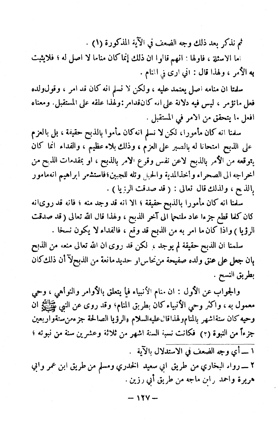 لَكِنْ لَا نُسَلِّمُ أَنَّهُ كَانَ مَأْمُورًا بِالذَّبْحِ حَقِيقَةً بَلْ بِالْعَزْمِ عَلَى الذَّبْحِ امْتِحَانًا لَهُ بِالصَّبْرِ عَلَى الْعَزْمِ، وَذَلِكَ بَلَاءٌ عَظِيمٌ، وَالْفِدَاءُ إِنَّمَا كَانَ عَمَّا يَتَوَقَّعُهُ مِنَ الْأَمْرِ بِالذَّبْحِ لَا عَنْ نَفْسِ وُقُوعِ الْأَمْرِ بِالذَّبْحِ، أَوْ بِمُقَدِّمَاتِ الذَّبْحِ مِنْ إِخْرَاجِهِ إِلَى الصَّحْرَاءِ وَأَخْذِ الْمُدْيَةِ وَالْحَبْلِ وَتَلِّهِ لِلْجَبِينِ، فَاسْتَشْعَرَ إِبْرَاهِيمُ أَنَّهُ مَأْمُورٌ بِالذَّبْحِ وَلِذَلِكَ قَالَ تَعَالَى: {قَدْ صَدَّقْتَ الرُّؤْيَا} سَلَّمْنَا أَنَّهُ كَانَ مَأْمُورًا بِالذَّبْحِ حَقِيقَةً إِلَّا أَنَّهُ قَدْ وَجَدَ مِنْهُ، فَإِنَّهُ قَدْ رُوِيَ أَنَّهُ كَانَ كُلَّمَا قَطَعَ جُزْءًا عَادَ مُلْتَحِمًا إِلَى آخِرِ الذَّبْحِ، وَلِهَذَا قَالَ اللَّهُ تَعَالَى: {قَدْ صَدَّقْتَ الرُّؤْيَا} وَإِذَا كَانَ مَا أُمِرَ بِهِ مِنَ الذَّبْحِ قَدْ وَقَعَ، فَالْفِدَاءُ لَا يَكُونُ نَسْخًا.