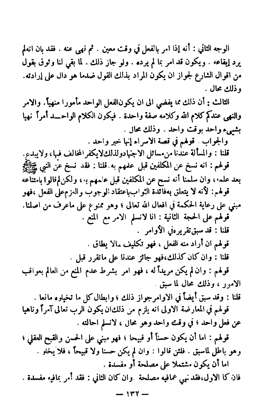 الثَّالِثُ: أَنَّ ذَلِكَ مِمَّا يُفْضِي إِلَى أَنْ يَكُونَ الْفِعْلُ الْوَاحِدُ مَأْمُورًا مَنْهِيًّا، وَالْأَمْرُ وَالنَّهْيُ عِنْدَكُمْ كَلَامُ اللَّهِ وَكَلَامُهُ صِفَةٌ وَاحِدَةٌ، فَيَكُونَ الْكَلَامُ الْوَاحِدُ أَمْرًا نَهْيًا بِشَيْءٍ وَاحِدٍ فِي وَقْتٍ وَاحِدٍ، وَذَلِكَ مُحَالٌ.