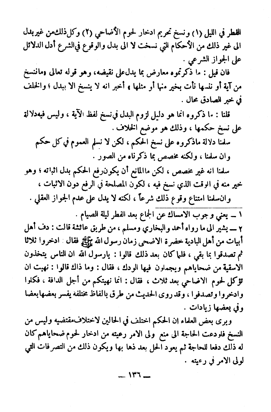 الْفِطْرِ فِي اللَّيْلِ (١) وَنَسْخِ تَحْرِيمِ ادِّخَارِ لُحُومِ الْأَضَاحِيِّ (٢) وَكُلُّ ذَلِكَ بَدَلٌ مِنْ غَيْرِ بَدَلٍ إِلَى غَيْرِ ذَلِكَ مِنَ الْأَحْكَامِ الَّتِي نُسِخَتْ لَا إِلَى بَدَلٍ.