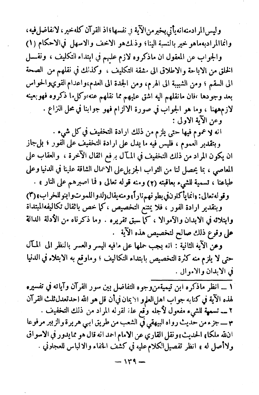 وَبِتَقْدِيرِ الْعُمُومِ فَلَيْسَ فِيهِ مَا يَدُلُّ عَلَى إِرَادَةِ التَّخْفِيفِ عَلَى الْفَوْرِ بَلْ جَازَ أَنْ يَكُونَ الْمُرَادُ مِنْ ذَلِكَ التَّخْفِيفَ فِي الْمَآلِ بِرَفْعِ أَثْقَالِ الْآخِرَةِ وَالْعِقَابِ عَلَى الْمَعَاصِي بِمَا يَحْصُلُ لَنَا مِنَ الثَّوَابِ الْجَزِيلِ عَلَى الْأَعْمَالِ الشَّاقَّةِ عَلَيْنَا فِي الدُّنْيَا وَعَلَى طِبَاعِنَا تَسْمِيَةً لِلشَّيْءِ بِعَاقِبَتِهِ. (٢) وَمِنْهُ قَوْلُهُ تَعَالَى: {فَمَا أَصْبَرَهُمْ عَلَى النَّارِ} ، وَقَوْلُهُ تَعَالَى: {إِنَّمَا يَأْكُلُونَ فِي} ، وَمِنْهُ يُقَالُ: ( «لُدُّوا لِلْمَوْتِ وَابْنُوا لِلْخَرَابِ» ) (٣) وَبِتَقْدِيرِ إِرَادَةِ الْفَوْرِ فَلَا يَمْتَنِعُ التَّخْصِيصُ كَمَا خَصَّ بِأَثْقَالِ تَكَالِيفِهِ الْمُبْتَدَأَةِ وَابْتِلَائِهِ فِي الْأَبْدَانِ وَالْأَمْوَالِ، كَمَا سَبَقَ تَقْرِيرُهُ.