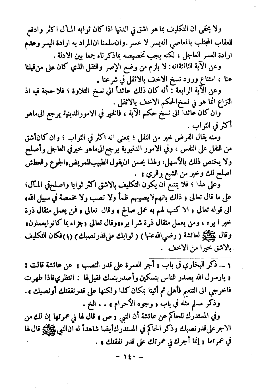 (١) ذَكَرَ الْبُخَارِيُّ فِي بَابِ " أَجْرُ الْعُمْرَةِ عَلَى قَدْرِ النَّصَبِ " عَنْ عَائِشَةَ قَالَتْ: يَا رَسُولَ اللَّهِ يَصْدُرُ النَّاسُ بِنُسُكَيْنِ وَأَصْدُرُ بِنُسُكٍ فَقِيلَ لَهَا: انْتَظِرِي فَإِذَا طَهُرْتِ فَاخْرُجِي إِلَى التَّنْعِيمِ فَأَهِلِّي ثُمَّ ائْتِينَا بِمَكَانِ كَذَا وَلَكِنَّهَا عَلَى قَدْرِ نَفَقَتِكِ أَوْ نَصَبِكِ " وَذَكَرَ مُسْلِمٌ مِثْلَهُ فِي بَابِ " وُجُوهِ الْإِحْرَامِ ". . . إِلَخْ. وَفِي الْمُسْتَدْرَكِ لِلْحَاكِمِ عَنْ عَائِشَةَ أَنَّ النَّبِيَّ - صَلَّى اللَّهُ عَلَيْهِ وَسَلَّمَ - قَالَ لَهَا فِي عُمْرَتِهَا: " إِنَّ لَكِ مِنَ الْأَجْرِ عَلَى قَدْرِ نَصَبِكِ ". وَذَكَرَ الْحَاكِمُ فِي الْمُسْتَدْرَكِ أَيْضًا شَاهِدًا لَهُ أَنَّ النَّبِيَّ - صَلَّى اللَّهُ عَلَيْهِ وَسَلَّمَ - قَالَ لَهَا فِي عُمْرَتِهَا: " إِنَّمَا أَجْرُكِ فِي عُمْرَتِكِ عَلَى قَدْرِ نَفَقَتِكِ ".