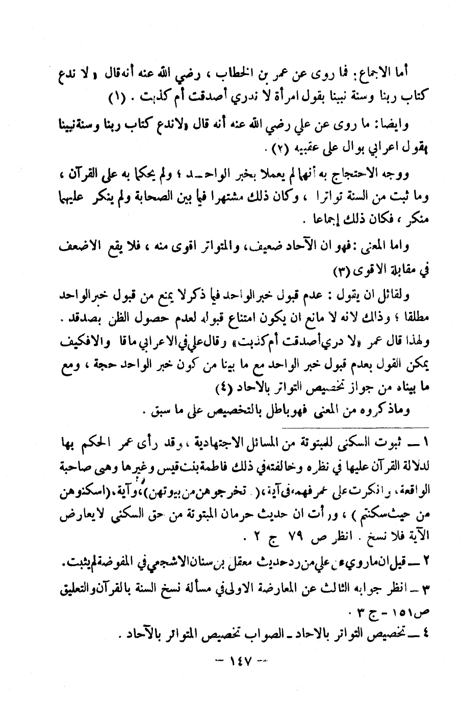 وَلِهَذَا قَالَ عُمَرُ: " لَا نَدْرِي أَصَدَقَتْ أَمْ كَذَبَتْ " وَقَالَ عَلِيٌّ فِي الْأَعْرَابِيِّ مَا قَالَ، وَإِلَّا فَكَيْفَ يُمْكِنُ الْقَوْلُ بِعَدَمِ قَبُولِ خَبَرِ الْوَاحِدِ مَعَ مَا بَيَّنَّا مِنْ كَوْنِ خَبَرِ الْوَاحِدِ حُجَّةً، وَمَعَ مَا بَيَّنَّاهُ مِنْ جَوَازِ تَخْصِيصِ التَّوَاتُرِ بِالْآحَادِ. (٤) وَمَا ذَكَرُوهُ مِنَ الْمَعْنَى فَهُوَ بَاطِلٌ بِالتَّخْصِيصِ عَلَى مَا سَبَقَ.