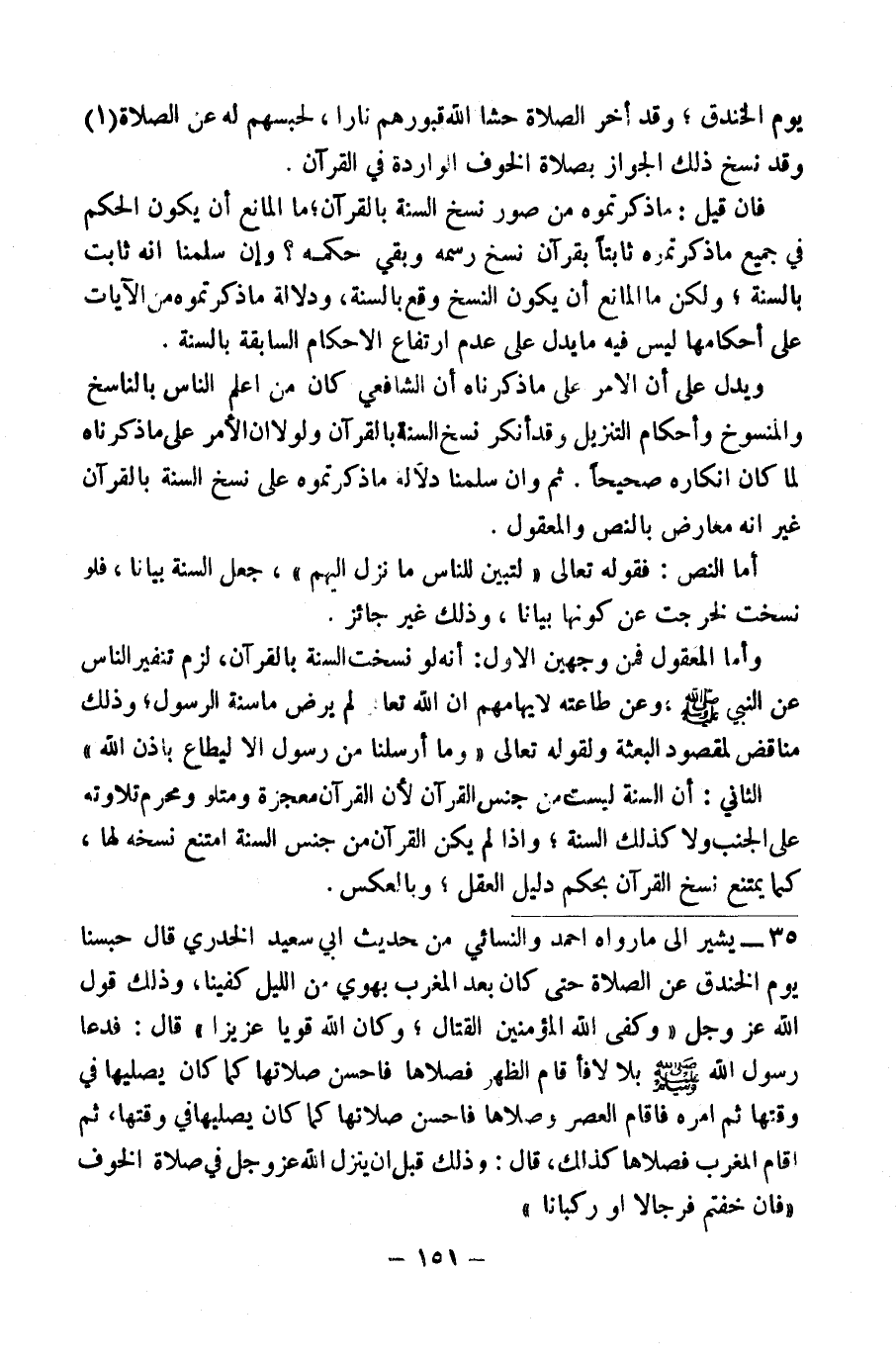 (١) يُشِيرُ إِلَى مَا رَوَاهُ أَحْمَدُ وَالنَّسَائِيُّ مِنْ حَدِيثِ أَبِي سَعِيدٍ الْخُدْرِيِّ قَالَ: حُبِسْنَا يَوْمَ الْخَنْدَقِ عَنِ الصَّلَاةِ حَتَّى كَانَ بَعْدَ الْمَغْرِبِ بِهُوِيٍّ مِنَ اللَّيْلِ كُفِينَا، وَذَلِكَ قَوْلُ اللَّهِ عَزَّ وَجَلَّ: " (وَكَفَى اللَّهُ الْمُؤْمِنِينَ الْقِتَالَ وَكَانَ اللَّهُ قَوِيًّا عَزِيزًا) "، قَالَ: فَدَعَا رَسُولُ اللَّهِ صَلَّى اللَّهُ عَلَيْهِ وَسَلَّمَ بِلَالًا فَأَقَامَ الظَّهْرَ فَصَلَّاهَا فَأَحْسَنَ صَلَاتَهَا كَمَا كَانَ يُصَلِّيهَا فِي وَقْتِهَا ثُمَّ أَمَرَهُ فَأَقَامَ الْعَصْرَ وَصَلَّاهَا فَأَحْسَنَ صَلَاتَهَا كَمَا كَانَ يُصَلِّيهَا فِي وَقْتِهَا، ثُمَّ أَقَامَ الْمَغْرِبَ فَصَلَّاهَا كَذَلِكَ، قَالَ: وَذَلِكَ قَبْلَ أَنْ يُنْزِلَ اللَّهُ عَزَّ وَجَلَّ صَلَاةَ الْخَوْفِ: (فَإِنْ خِفْتُمْ فَرِجَالًا أَوْ رُكْبَانًا) .