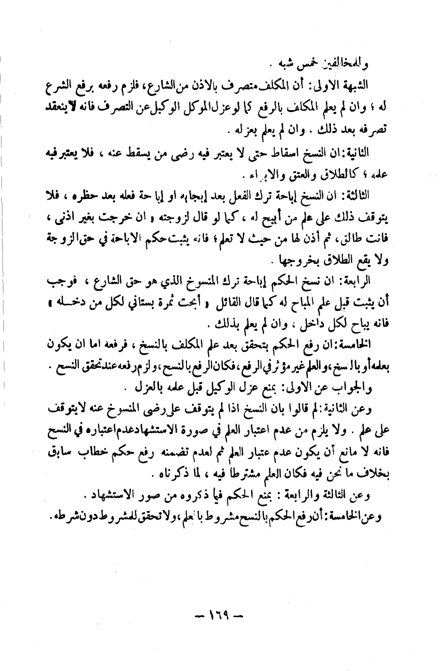 الشُّبْهَةُ الْأُولَى: أَنَّ الْمُكَلَّفَ مُتَصَرِّفٌ بِالْإِذْنِ مِنَ الشَّارِعِ، فَلَزِمَ رَفْعُهُ بِرَفْعِ الشَّرْعِ لَهُ وَإِنْ لَمْ يَعْلَمَ الْمُكَلَّفُ بِالرَّفْعِ، كَمَا لَوْ عَزَلَ الْمُوَكِّلُ الْوَكِيلَ عَنِ التَّصَرُّفِ فَإِنَّهُ لَا يَنْعَقِدُ تَصَرُّفُهُ بَعْدَ ذَلِكَ وَإِنْ لَمْ يَعْلَمْ بِعَزْلِهِ.