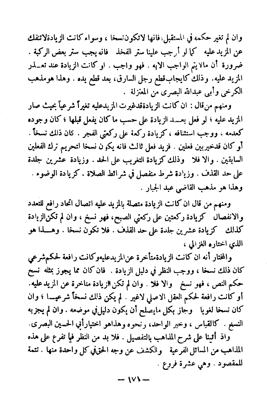 وَمِنْهُمْ مَنْ قَالَ: إِنْ كَانَتِ الزِّيَادَةُ قَدْ غَيَّرَتِ الْمَزِيدَ عَلَيْهِ تَغَيُّرًا شَرْعِيًّا، بِحَيْثُ صَارَ الْمَزِيدُ عَلَيْهِ لَوْ فُعِلَ بَعْدَ الزِّيَادَةِ عَلَى حَسَبِ مَا كَانَ يُفْعَلُ قَبْلَهَا كَانَ وُجُودُهُ كَعَدَمِهِ وَوَجَبَ اسْتِئْنَافُهُ، كَزِيَادَةِ رَكْعَةٍ عَلَى رَكْعَتَيِ الْفَجْرِ، كَانَ ذَلِكَ نَسْخًا، أَوْ كَانَ قَدْ خُيِّرَ بَيْنَ فِعْلَيْنِ فَزِيدَ فِعْلٌ ثَالِثٌ، فَإِنَّهُ يَكُونُ نَسْخًا لِتَحْرِيمِ تَرْكِ الْفِعْلَيْنِ السَّابِقَيْنِ، وَإِلَّا فَلَا، وَذَلِكَ كَزِيَادَةِ التَّغْرِيبِ عَلَى الْحَدِّ، وَزِيَادَةِ عِشْرِينَ جَلْدَةً عَلَى حَدِّ الْقَذْفِ، وَزِيَادَةِ شَرْطٍ مُنْفَصِلٍ فِي شَرَائِطِ الصَّلَاةِ كَزِيَادَةِ الْوُضُوءِ. وَهَذَا هُوَ مَذْهَبُ الْقَاضِي عَبْدِ الْجَبَّارِ.