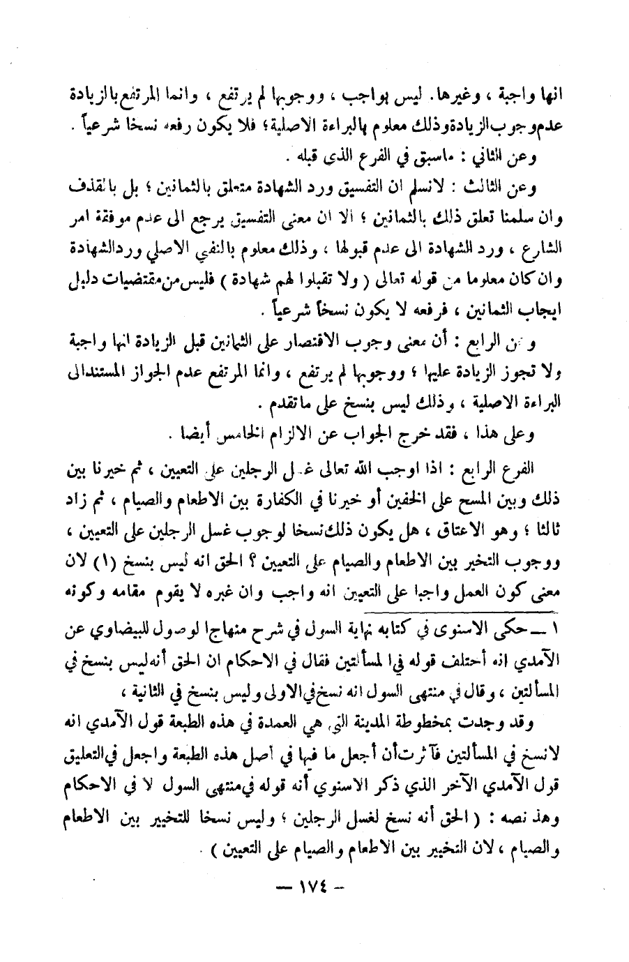 (١) حَكَى الْإِسْنَوِيُّ فِي كِتَابِهِ " نِهَايَةُ السُّولِ فِي شَرْحِ مِنْهَاجِ الْوُصُولِ " لِلْبَيْضَاوِيِّ عَنِ الْآمِدِيِّ أَنَّهُ اخْتَلَفَ قَوْلُهُ فِي الْمَسْأَلَتَيْنِ، فَقَالَ فِي الْإِحْكَامِ: إِنَّ الْحَقَّ أَنَّهُ لَيْسَ بِنَسْخٍ فِي الْمَسْأَلَتَيْنِ، وَقَالَ فِي مُنْتَهَى السُّولِ: إِنَّهُ نَسْخٌ فِي الْأُولَى وَلَيْسَ بِنَسْخٍ فِي الثَّانِيَةِ. وَقَدْ وَجَدْتُ بِمَخْطُوطَةِ الْمَدِينَةِ الَّتِي هِيَ الْعُمْدَةُ فِي هَذِهِ الطَّبْعَةِ قَوْلَ الْآمِدِيِّ أَنَّهُ لَا نَسْخَ فِي الْمَسْأَلَتَيْنِ فَآثَرْتُ أَنْ أَجْعَلَ مَا فِيهَا فِي أَصْلِ هَذِهِ الطَّبْعَةِ وَأَجْعَلَ فِي التَّعْلِيقِ قَوْلَ الْآمِدِيِّ الْآخَرَ الَّذِي ذَكَرَ الْإِسْنَوِيُّ أَنَّهُ قَوْلُهُ فِي مُنْتَهَى السُّولِ لَا فِي الْإِحْكَامِ وَهَذَا نَصُّهُ: (الْحَقُّ أَنَّهُ نَسْخٌ لِغَسْلِ الرِّجْلَيْنِ، وَلَيْسَ نَسْخًا لِلتَّخْيِيرِ بَيْنَ الْإِطْعَامِ وَالصِّيَامِ، لِأَنَّ التَّخْيِيرَ بَيْنَ الْإِطْعَامِ وَالصِّيَامِ عَلَى التَّعْيِينِ)