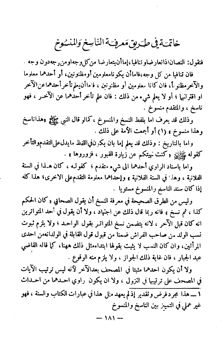 (١) هَذَا مُجَرَّدُ فَرْضٍ وَتَقْدِيرٍ إِذْ لَمْ يُعْهَدْ مِثْلُ هَذَا فِي عِبَارَاتِ الْكِتَابِ وَالسُّنَّةِ، فَهُوَ غَيْرُ عَمَلِيٍّ فِي التَّمْيِيزِ بَيْنَ النَّاسِخِ وَالْمَنْسُوخِ