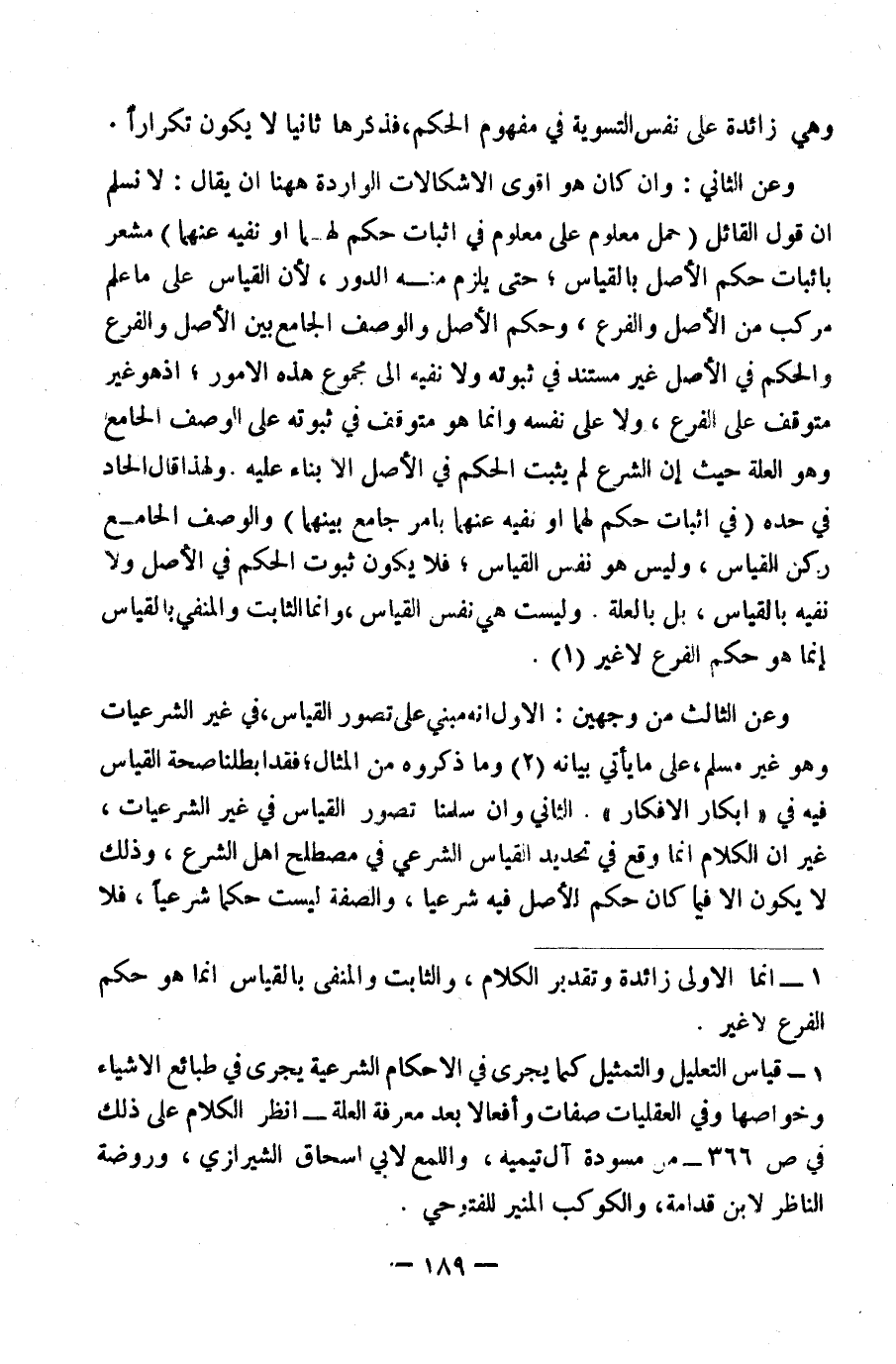 (٢) قِيَاسُ التَّعْلِيلِ وَالتَّمْثِيلِ كَمَا يَجْرِي فِي الْأَحْكَامِ الشَّرْعِيَّةِ يَجْرِي فِي طَبَائِعِ الْأَشْيَاءِ وَخَوَاصِّهَا، وَفِي الْعَقْلِيَّاتِ صِفَاتٍ وَأَفْعَالًا بَعْدَ مَعْرِفَةِ الْعِلَّةِ، انْظُرِ الْكَلَامَ عَلَى ذَلِكَ فِي ص ٣٦٦ مِنْ مُسَوَّدَةِ آلِ تَيْمِيَّةَ، وَاللُّمَعِ لِأَبِي إِسْحَاقَ الشِّيرَازِيِّ، وَرَوْضَةِ النَّاظِرِ لِابْنِ قُدَامَةَ، وَالْكَوْكَبِ الْمُنِيرِ لِلْفُتُوحِيِّ.