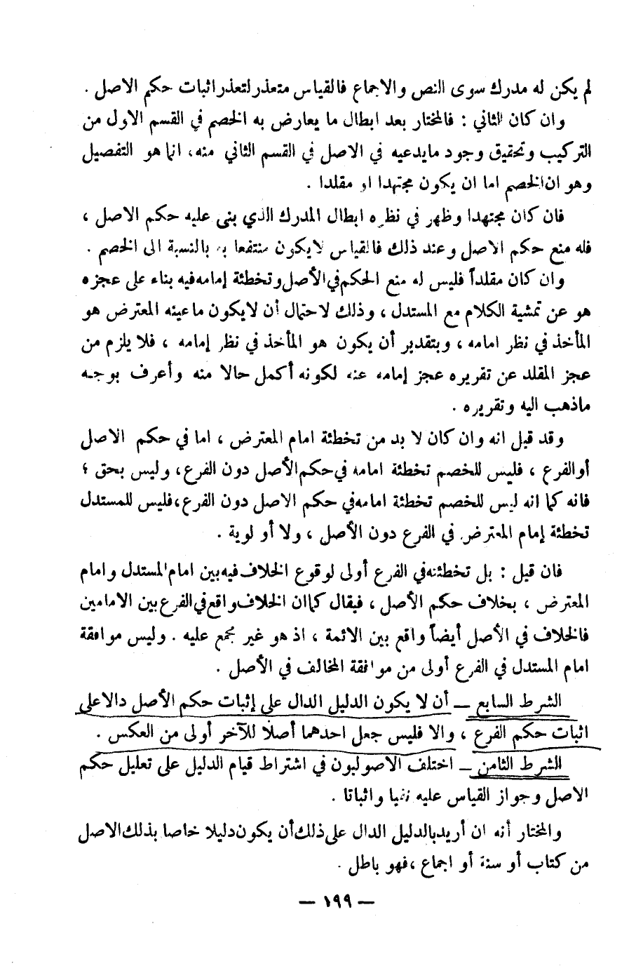 الشَّرْطُ السَّابِعُ: أَنْ لَا يَكُونُ الدَّلِيلُ الدَّالُّ عَلَى إِثْبَاتِ حُكْمِ الْأَصْلِ دَالًّا عَلَى إِثْبَاتِ حُكْمِ الْفَرْعِ، وَإِلَّا فَلَيْسَ جَعْلُ أَحَدِهِمَا أَصْلًا لِلْآخَرِ أَوْلَى مِنَ الْعَكْسِ.