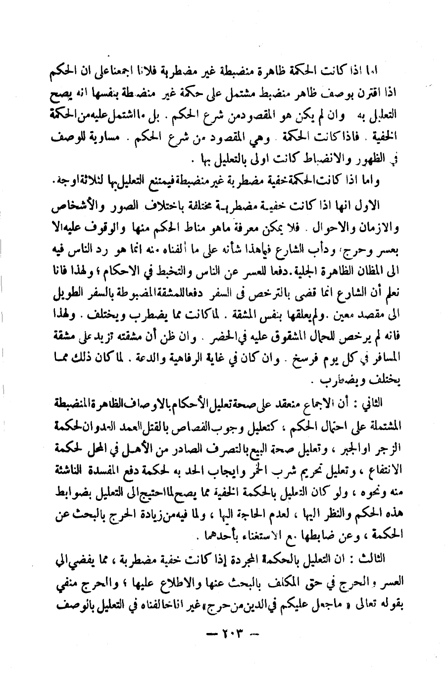 الثَّالِثُ: أَنَّ التَّعْلِيلَ بِالْحِكْمَةِ الْمُجَرَّدَةِ إِذَا كَانَتْ خَفِيَّةً مُضْطَرِبَةً مِمَّا يُفْضِي إِلَى الْعُسْرِ وَالْحَرَجِ فِي حَقِّ الْمُكَلَّفِ بِالْبَحْثِ عَنْهَا وَالِاطِّلَاعِ عَلَيْهَا، وَالْحَرَجُ مَنْفِيٌّ بِقَوْلِهِ تَعَالَى: {وَمَا جَعَلَ عَلَيْكُمْ فِي الدِّينِ مِنْ حَرَجٍ} غَيْرَ أَنَّا خَالَفْنَاهُ فِي التَّعْلِيلِ بِالْوَصْفِ