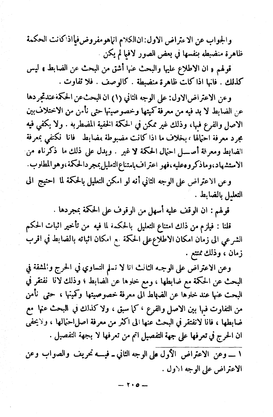 وَالْجَوَابُ عَنِ الِاعْتِرَاضِ الْأَوَّلِ: أَنَّ الْكَلَامَ إِنَّمَا هُوَ مَفْرُوضٌ فِيمَا إِذَا كَانَتِ الْحِكْمَةُ ظَاهِرَةً مُنْضَبِطَةً بِنَفْسِهَا فِي بَعْضِ الصُّوَرِ لَا فِيمَا لَمْ يَكُنْ.