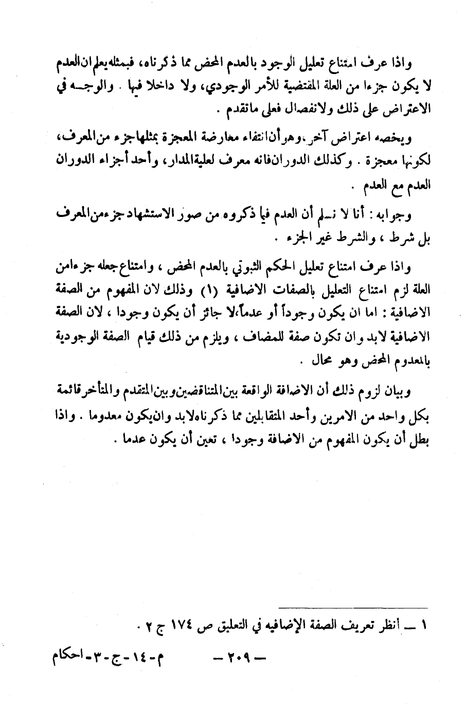 وَإِذَا عُرِفَ امْتِنَاعُ الْوُجُودِ بِالْعَدَمِ الْمَحْضِ مِمَّا ذَكَرْنَاهُ فَبِمِثْلِهِ يُعْلَمُ أَنَّ الْعَدَمَ لَا يَكُونُ جُزْءًا مِنَ الْعِلَّةِ الْمُقْتَضِيَةِ لِلْأَمْرِ الْوُجُودِيِّ وَلَا دَاخِلًا فِيهَا، وَالْوَجْهُ فِي الِاعْتِرَاضِ عَلَى ذَلِكَ وَالِانْفِصَالِ فَعَلَى مَا تَقَدَّمَ.