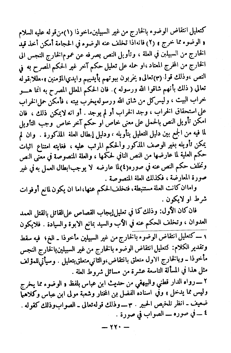 كَتَعْلِيلِ انْتِقَاضِ الْوُضُوءِ بِالْخَارِجِ مِنْ غَيْرِ السَّبِيلَيْنِ مَأْخُوذًا (١) مِنْ قَوْلِهِ عَلَيْهِ السَّلَامُ: " «الْوُضُوءُ مِمَّا خَرَجَ» " (٢) ، فَإِنَّهُ إِذَا تَخَلَّفَ عَنْهُ الْوُضُوءُ فِي الْحِجَامَةِ أَمْكَنَ أَخْذُ قَيْدِ الْخَارِجِ مِنَ السَّبِيلَيْنِ فِي الْعِلَّةِ، وَتَأْوِيلُ النَّصِّ بِصَرْفِهِ عَنْ عُمُومِ الْخَارِجِ النَّجِسِ إِلَى الْخَارِجِ مِنَ الْمَخْرَجِ الْمُعْتَادِ أَوْ حَمْلُهُ عَلَى حُكْمٍ آخَرَ غَيْرِ الْحُكْمِ الْمُصَرَّحِ بِهِ فِي النَّصِّ، وَذَلِكَ قَوْلُهُ (٣) تَعَالَى: {يُخْرِبُونَ بُيُوتَهُمْ بِأَيْدِيهِمْ وَأَيْدِي الْمُؤْمِنِينَ} مُعَلَّلًا بِقَوْلِهِ تَعَالَى: {ذَلِكَ بِأَنَّهُمْ شَاقُّوا اللَّهَ وَرَسُولَهُ} فَإِنَّ الْحُكْمَ الْمُعَلَّلَ الْمُصَرَّحَ بِهِ إِنَّمَا هُوَ خَرَابُ الْبَيْتِ، وَلَيْسَ كُلُّ مَنْ شَاقَّ اللَّهَ وَرَسُولَهُ يُخَرِّبُ بَيْتَهُ فَأَمْكَنَ حَمْلُ الْخَرَابِ عَلَى اسْتِحْقَاقِ الْخَرَابِ وُجِدَ الْخَرَابُ أَوْ لَمْ يُوجَدْ، أَوْ أَنَّهُ لَا يُمْكِنُ ذَلِكَ فَإِنْ أَمْكَنَ تَأْوِيلُ النَّصِّ بِالْحَمْلِ عَلَى مَعْنًى خَاصٍّ أَوْ حُكْمٍ آخَرَ خَاصٍّ وَجَبَ التَّأْوِيلُ لِمَا فِيهِ مِنَ الْجَمْعِ بَيْنَ دَلِيلِ التَّعْلِيلِ بِتَأْوِيلِهِ وَدَلِيلِ إِبْطَالِ الْعِلَّةِ الْمَذْكُورَةِ، وَإِنْ لَمْ يُمْكِنْ تَأْوِيلُهُ بِغَيْرِ الْوَصْفِ الْمَذْكُورِ وَالْحُكْمِ الْمُرَتَّبِ عَلَيْهِ فَغَايَتُهُ امْتِنَاعُ إِثْبَاتِ حُكْمِ الْعِلِّيَّةِ لِمَا عَارَضَهَا مِنَ النَّصِّ النَّافِي لِحُكْمِهَا. وَالْعِلَّةُ الْمَنْصُوصَةُ فِي مَعْنَى النَّصِّ وَتَخَلُّفُ حُكْمِ النَّصِّ عَنْهُ فِي صُوَرِهِ (٤) لِمَا عَارَضَهُ - لَا يُوجِبُ إِبْطَالَ الْعَمَلِ بِهِ فِي غَيْرِ صُورَةِ الْمُعَارَضَةِ، فَكَذَلِكَ الْعِلَّةُ الْمَنْصُوصَةُ.