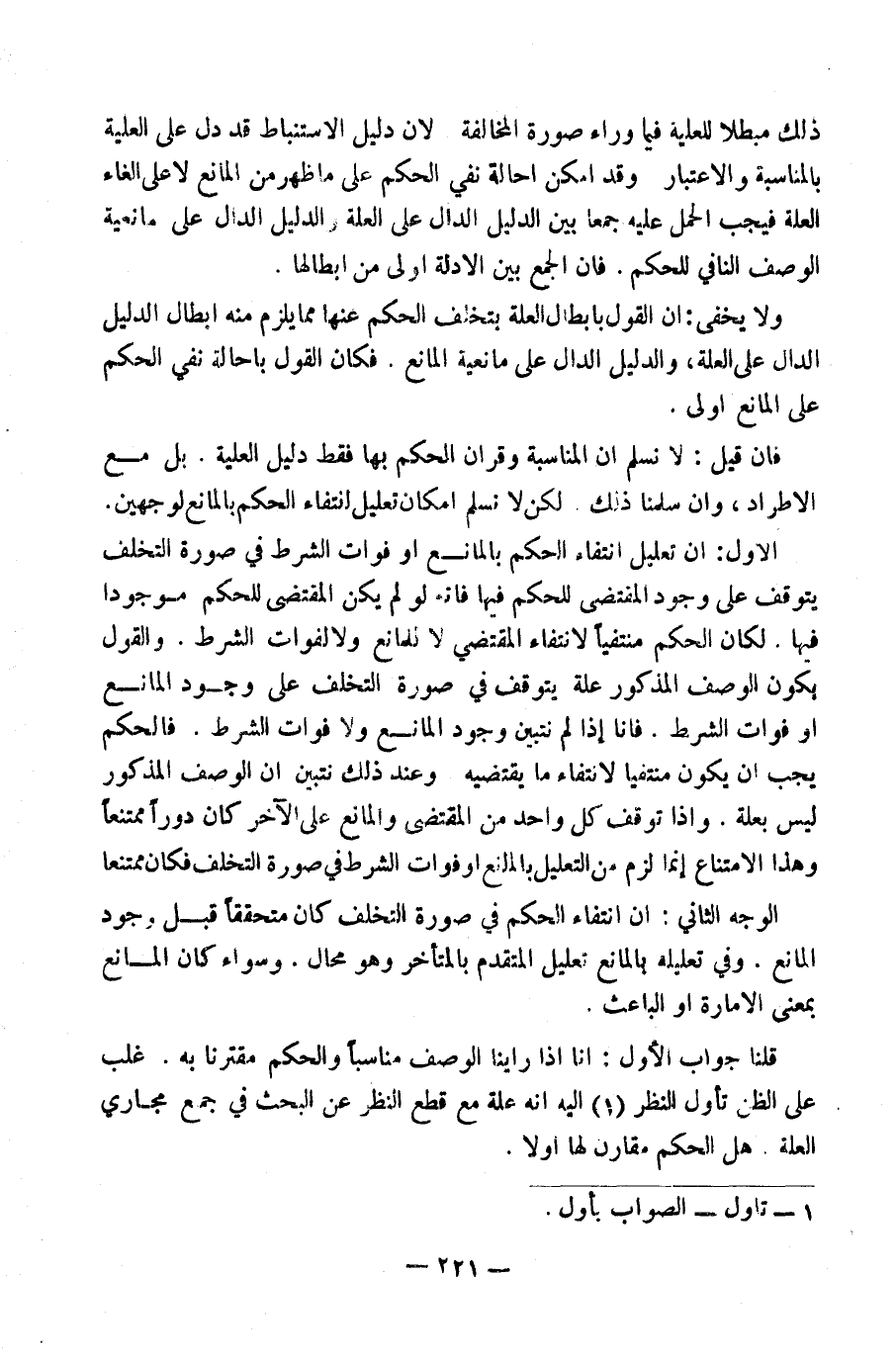 الْأَوَّلُ: أَنَّ تَعْلِيلَ انْتِفَاءِ الْحُكْمِ بِالْمَانِعِ أَوْ فَوَاتِ الشَّرْطِ فِي صُورَةِ التَّخَلُّفِ يَتَوَقَّفُ عَلَى وُجُودِ الْمُقْتَضِي لِلْحُكْمِ فِيهَا، فَإِنَّهُ لَوْ لَمْ يَكُنِ الْمُقْتَضِي لِلْحُكْمِ مَوْجُودًا فِيهَا لَكَانَ الْحُكْمُ مُنْتَفِيًا لِانْتِفَاءِ الْمُقْتَضِي لَا لِلْمَانِعِ وَلَا لِفَوَاتِ الشَّرْطِ، وَالْقَوْلُ بِكَوْنِ الْوَصْفِ الْمَذْكُورِ عِلَّةً يَتَوَقَّفُ فِي صُورَةِ التَّخَلُّفِ عَلَى وُجُودِ الْمَانِعِ أَوْ فَوَاتِ الشَّرْطِ، فَإِنَّا إِذَا لَمْ نَتَبَيَّنْ وُجُودَ الْمَانِعِ وَلَا فَوَاتَ الشَّرْطِ فَالْحُكْمُ يَجِبُ أَنْ يَكُونَ مُنْتَفِيًا لِانْتِفَاءِ مَا يَقْتَضِيهِ، وَعِنْدَ ذَلِكَ نَتَبَيَّنُ أَنَّ الْوَصْفَ الْمَذْكُورَ لَيْسَ بِعِلَّةٍ، وَإِذَا تَوَقَّفَ كُلُّ وَاحِدٍ مِنَ الْمُقْتَضِي وَالْمَانِعِ عَلَى الْآخَرِ كَانَ دَوْرًا مُمْتَنِعًا، وَهَذَا الِامْتِنَاعُ إِنَّمَا لَزِمَ مِنَ التَّعْلِيلِ بِالْمَانِعِ أَوْ فَوَاتِ الشَّرْطِ فِي صُورَةِ التَّخَلُّفِ فَكَانَ مُمْتَنِعًا.