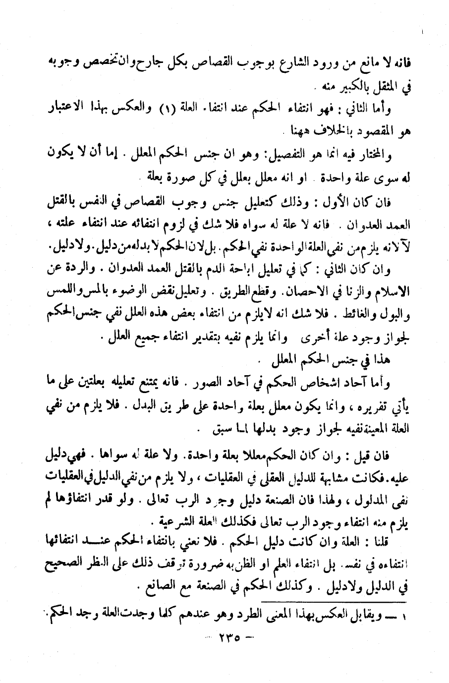 فَإِنْ كَانَ الْأَوَّلَ، وَذَلِكَ كَتَعْلِيلِ جِنْسِ وُجُوبِ الْقِصَاصِ فِي النَّفْسِ بِالْقَتْلِ الْعَمْدِ الْعُدْوَانِ فَإِنَّهُ لَا عِلَّةَ لَهُ سِوَاهُ، فَلَا شَكَّ فِي لُزُومِ انْتِفَائِهِ عِنْدَ انْتِفَاءِ عِلَّتِهِ، لَا لِأَنَّهُ يَلْزَمُ مِنْ نَفْيِ الْعِلَّةِ الْوَاحِدَةِ نَفْيُ الْحُكْمِ، بَلْ لِأَنَّ الْحُكْمَ لَا بُدَّ لَهُ مِنْ دَلِيلٍ وَلَا دَلِيلَ.