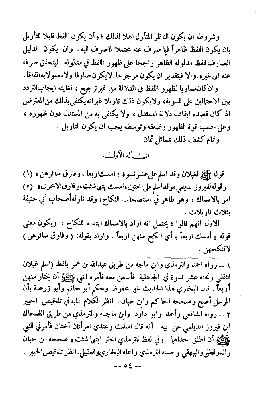 «قَوْلُهُ - صَلَّى اللَّهُ عَلَيْهِ وَسَلَّمَ - لِغَيْلَانَ وَقَدْ أَسْلَمَ عَلَى عَشْرِ نِسْوَةٍ: " أَمْسِكْ أَرْبَعًا وَفَارِقْ سَائِرَهُنَّ» " (١) «وَقَوْلُهُ لِفَيْرُوزٍ الدَّيْلَمِيِّ، وَقَدْ أَسْلَمَ عَلَى أُخْتَيْنِ: " أَمْسِكْ أَيَّتَهُمَا شِئْتَ، وَفَارِقِ الْأُخْرَى» " (٢) أَمْرٌ بِالْإِمْسَاكِ وَهُوَ ظَاهِرٌ فِي اسْتِصْحَابِ النِّكَاحِ، وَقَدْ تَأَوَّلَهُ أَصْحَابُ أَبِي حَنِيفَةَ بِثَلَاثِ تَأْوِيلَاتٍ، الْأَوَّلُ: أَنَّهُمْ قَالُوا يُحْتَمَلُ أَنَّهُ أَرَادَ بِالْإِمْسَاكِ ابْتِدَاءَ النِّكَاحِ، وَيَكُونُ مَعْنَى قَوْلِهِ " أَمْسِكْ أَرْبَعًا " أَيِ انْكِحْ مِنْهُنَّ أَرْبَعًا، وَأَرَادَ بِقَوْلِهِ " وَفَارِقْ سَائِرَهُنَّ " لَا تَنْكِحْهُنَّ.