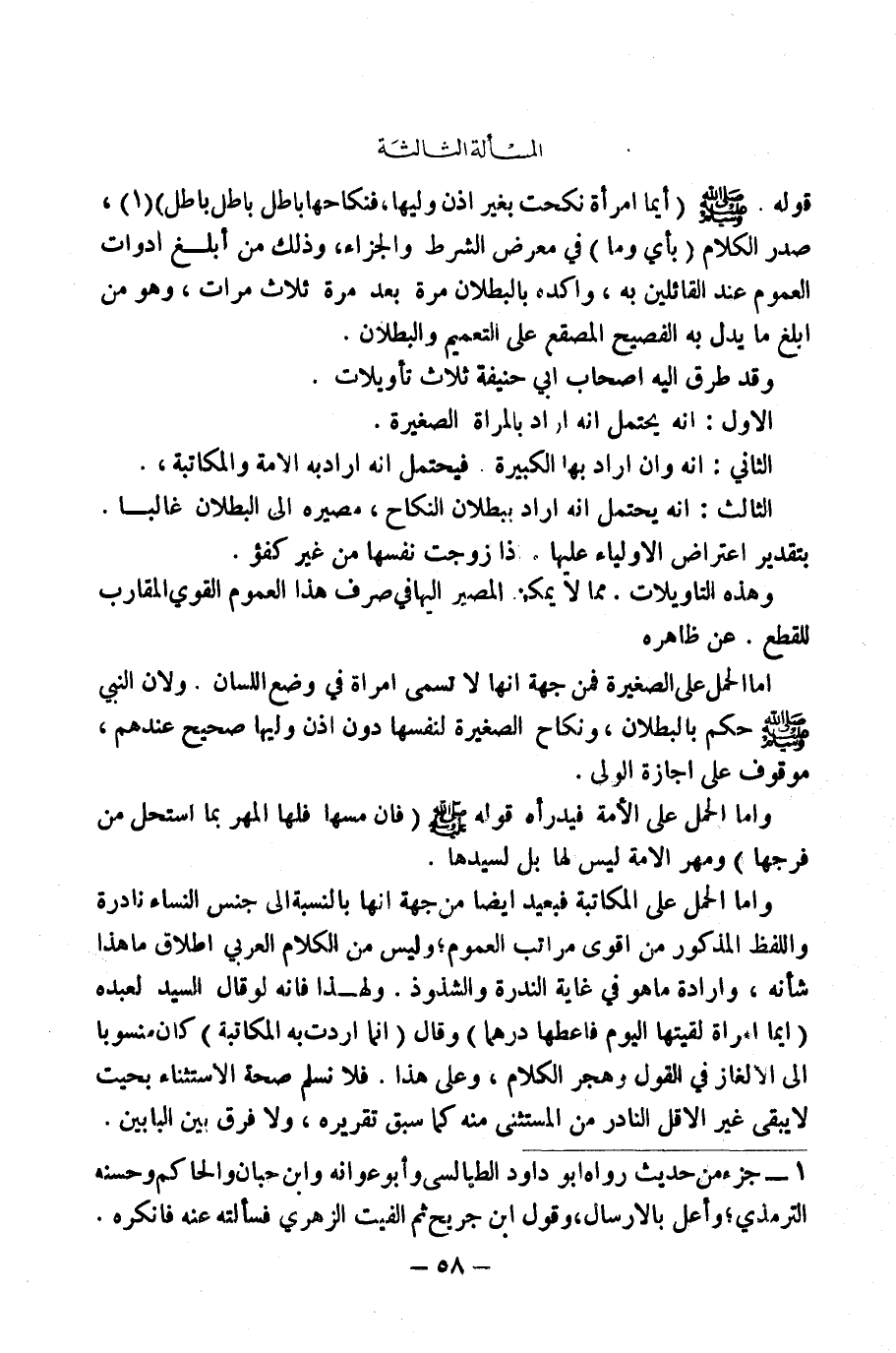 قَوْلُهُ - صَلَّى اللَّهُ عَلَيْهِ وَسَلَّمَ -: " «أَيُّمَا امْرَأَةٍ نَكَحَتْ نَفْسَهَا بِغَيْرِ إِذْنِ وَلِيِّهَا فَنِكَاحُهَا بَاطِلٌ بَاطِلٌ بَاطِلٌ» " (١) صَدَّرَ الْكَلَامَ (بِأَيِّ وَمَا) فِي مَعْرِضِ الشَّرْطِ وَالْجَزَاءِ، وَذَلِكَ مِنْ أَبْلَغِ أَدَوَاتِ الْعُمُومِ عِنْدَ الْقَائِلِينَ بِهِ وَأَكَّدَهُ بِالْبُطْلَانِ مَرَّةً بَعْدَ مَرَّةٍ ثَلَاثَ مَرَّاتٍ، وَهُوَ مِنْ أَبْلَغِ مَا يَدُلُّ بِهِ الْفَصِيحُ الْمُصْقِعُ عَلَى التَّعْمِيمِ وَالْبُطْلَانِ.