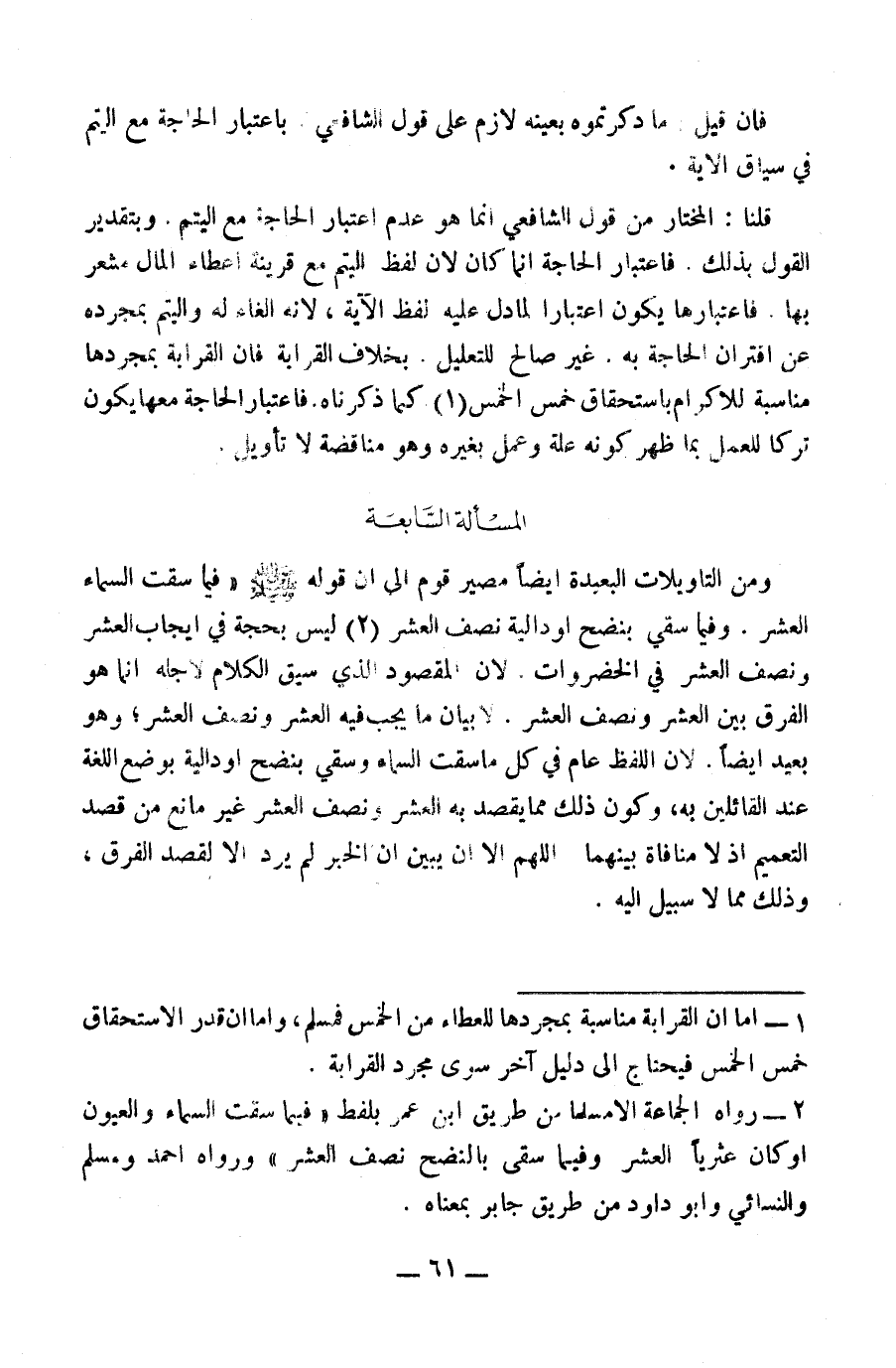 (١) أَمَّا إِنَّ الْقَرَابَةَ مُنَاسِبَةٌ بِمُجَرَّدِهَا لِلْعَطَاءِ مِنَ الْخُمُسِ فَمُسَلَّمٌ، وَأَمَّا إِنَّ قَدْرَ الِاسْتِحْقَاقِ خُمُسُ الْخُمُسِ فَيَحْتَاجُ إِلَى دَلِيلٍ آخَرَ سِوَى مُجَرَّدِ الْقَرَابَةِ.