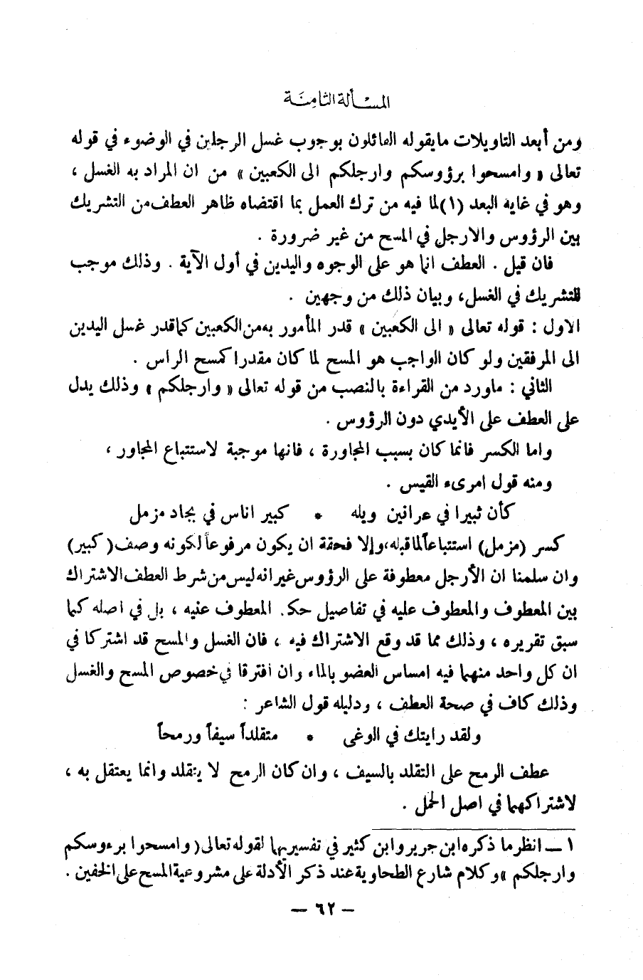 (١) انْظُرْ مَا ذَكَرَهُ ابْنُ جَرِيرٍ وَابْنُ كَثِيرٍ فِي تَفْسِيرَيْهِمَا لِقَوْلِهِ تَعَالَى: {وَامْسَحُوا بِرُءُوسِكُمْ وَأَرْجُلَكُمْ} وَكَلَامُ شَارِحِ الطَّحَاوِيَّةِ عِنْدَ ذِكْرِ الْأَدِلَّةِ عَلَى مَشْرُوعِيَّةِ الْمَسْحِ عَلَى الْخُفَّيْنِ.