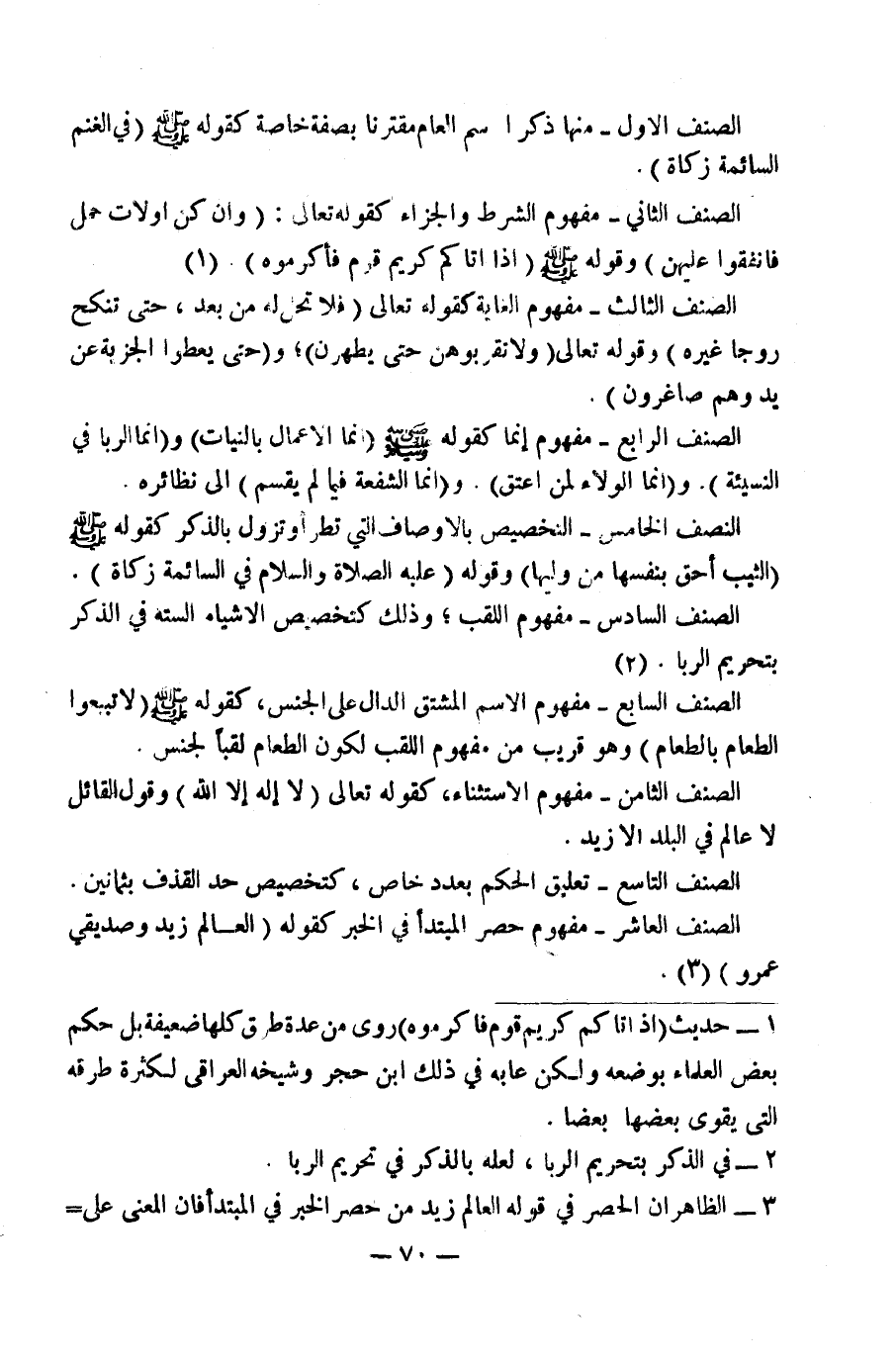 الصِّنْفُ السَّادِسُ: مَفْهُومُ اللَّقَبِ، وَذَلِكَ كَتَخْصِيصِ الْأَشْيَاءِ السِّتَّةِ فِي الذِّكْرِ بِتَحْرِيمِ الرِّبَا. (٢) الصِّنْفُ السَّابِعُ: مَفْهُومُ الِاسْمِ الْمُشْتَقِّ الدَّالِّ عَلَى الْجِنْسِ، كَقَوْلِهِ - صَلَّى اللَّهُ عَلَيْهِ وَسَلَّمَ -: " «لَا تَبِيعُوا الطَّعَامَ بِالطَّعَامِ» " وَهُوَ قَرِيبٌ مِنْ مَفْهُومِ اللَّقَبِ لِكَوْنِ الطَّعَامِ لَقَبًا لِجِنْسٍ.