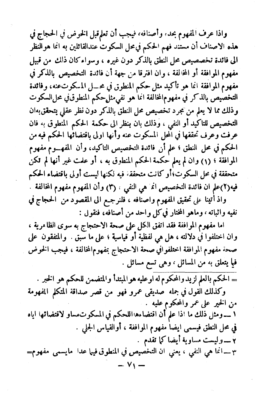 (٣) إِنَّمَا هِيَ النَّفْيُ، يَعْنِي أَنَّ التَّخْصِيصَ فِي الْمَنْطُوقِ فِيمَا عَدَا مَا يُسَمَّى مَفْهُومَ الْمُوَافَقَةِ يَدُلُّ عَلَى أَنَّهُ لَا يُحْكَمُ فِي الْمَسْكُوتِ بِمِثْلِ مَا حُكِمَ بِهِ فِي الْمَنْطُوقِ، أَمَّا أَنْ يَدُلَّ عَلَى ثُبُوتِ حُكْمٍ فِي الْمَسْكُوتِ مُخَالِفٍ لِحُكْمِ الْمَنْطُوقِ فَهَذَا مَحَلُّ نَظَرٍ وَاخْتِلَافٍ بَيْنَ الْعُلَمَاءِ عَلَى مَا سَيَجِيءُ، وَقَالَتِ الظَّاهِرِيَّةُ: إِنَّ التَّخْصِيصَ فِي الْمَنْطُوقِ لَا دَلَالَةَ لَهُ عَلَى إِثْبَاتِ حُكْمٍ مَا فِي الْمَسْكُوتِ وَلَا نَفْيِهِ.