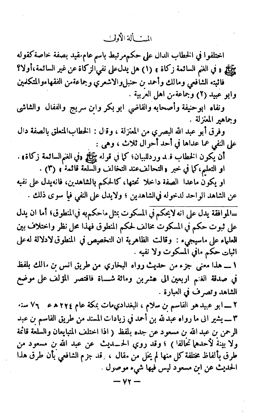 اخْتَلَفُوا فِي الْخِطَابِ الدَّالِّ عَلَى حُكْمٍ مُرْتَبِطٍ بِاسْمٍ عَامٍّ مُقَيَّدٍ بِصِفَةٍ خَاصَّةٍ كَقَوْلِهِ - صَلَّى اللَّهُ عَلَيْهِ وَسَلَّمَ -: " فِي الْغَنَمِ السَّائِمَةِ زَكَاةٌ " (١) هَلْ يَدُلُّ عَلَى نَفْيِ الزَّكَاةِ السَّائِمَةِ أَوْ لَا؟ فَأَثْبَتَهُ الشَّافِعِيُّ وَمَالِكٌ وَأَحْمَدُ بْنُ حَنْبَلٍ وَالْأَشْعَرِيُّ وَجَمَاعَةٌ مِنَ الْفُقَهَاءِ وَالْمُتَكَلِّمِينَ وَأَبُو عُبَيْدٍ (٢) وَجَمَاعَةٌ مِنْ أَهْلِ الْعَرَبِيَّةِ، وَنَفَاهُ أَبُو حَنِيفَةَ وَأَصْحَابُهُ وَالْقَاضِي أَبُو بَكْرٍ وَابْنُ سُرَيْجٍ وَالْقَفَّالُ وَالشَّاشِيُّ وَجَمَاهِيرُ الْمُعْتَزِلَةِ.