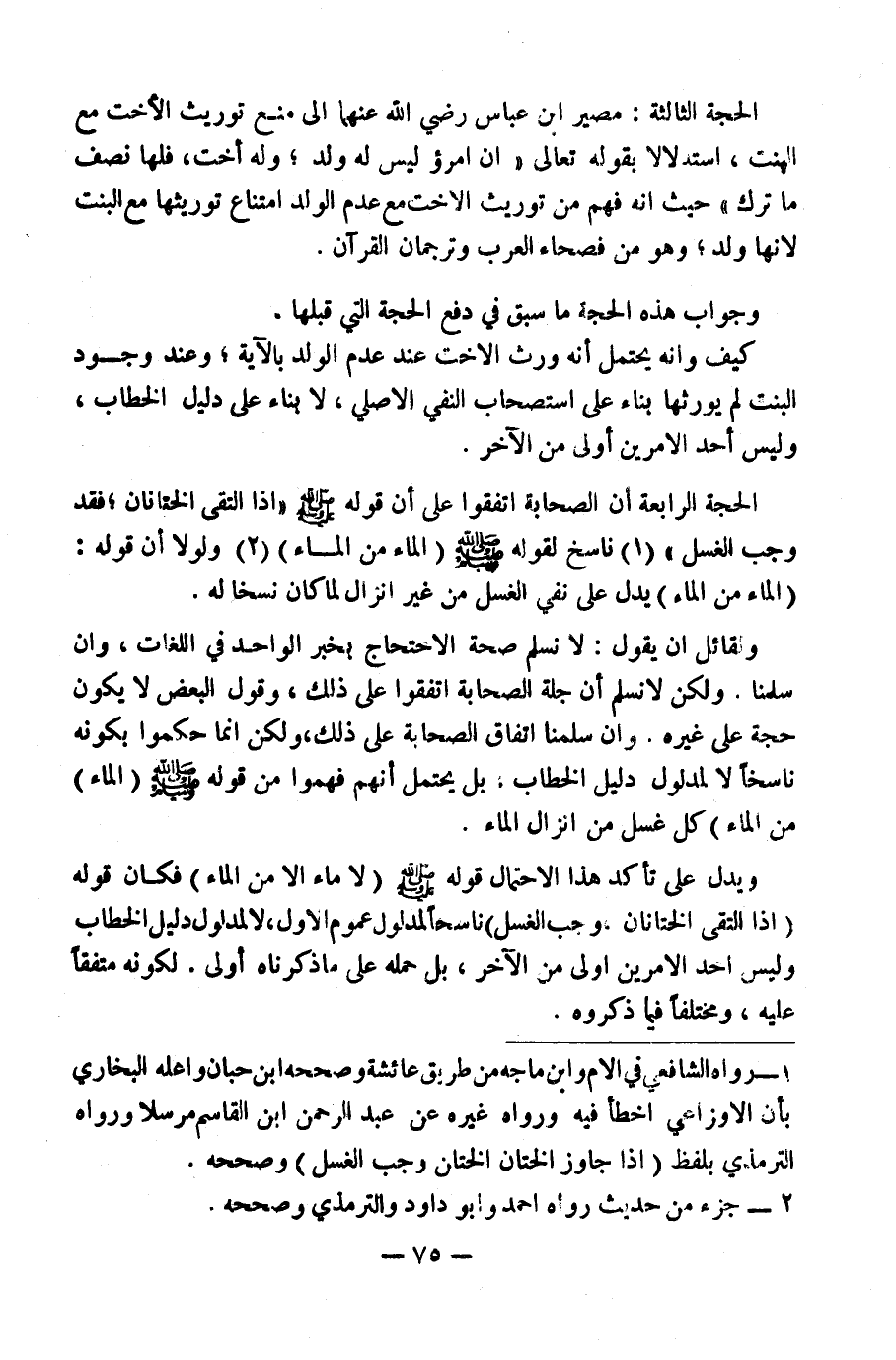 الْحُجَّةُ الرَّابِعَةُ: أَنَّ الصَّحَابَةَ اتَّفَقُوا عَلَى أَنَّ قَوْلَهُ - صَلَّى اللَّهُ عَلَيْهِ وَسَلَّمَ -: " إِذَا الْتَقَى الْخِتَانَانِ، فَقَدْ وَجَبَ الْغُسْلُ (١) نَاسِخٌ لِقَوْلِهِ - صَلَّى اللَّهُ عَلَيْهِ وَسَلَّمَ -: " «الْمَاءُ مِنَ الْمَاءِ» " (٢) وَلَوْلَا أَنَّ قَوْلَهُ: " «الْمَاءُ مِنَ الْمَاءِ» " يَدُلُّ عَلَى نَفْيِ الْغُسْلِ مِنْ غَيْرِ إِنْزَالٍ لَمَا كَانَ نَسْخًا لَهُ.