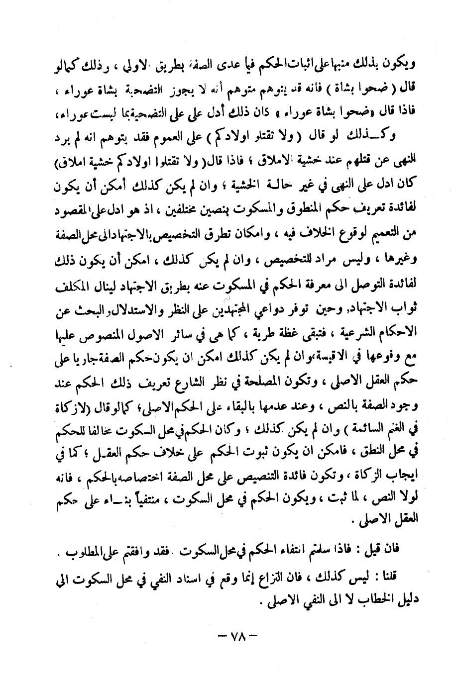 وَيَكُونُ بِذَلِكَ مُنَبِّهًا عَلَى إِثْبَاتِ الْحُكْمِ فِيمَا عَدَا الصِّفَةِ بِطَرِيقِ الْأَوْلَى، وَذَلِكَ كَمَا لَوْ قَالَ: " ضَحُّوا بِشَاةٍ " فَإِنَّهُ قَدْ يَتَوَهَّمُ مُتَوَهِّمٌ أَنَّهُ لَا يَجُوزُ التَّضْحِيَةُ بِشَاةٍ عَوْرَاءَ، فَإِذَا قَالَ: " ضَحُّوا بِشَاةٍ عَوْرَاءَ " كَانَ ذَلِكَ أَدَلَّ عَلَى التَّضْحِيَةِ بِمَا لَيْسَتْ عَوْرَاءَ، وَكَذَلِكَ لَوْ قَالَ: {وَلَا تَقْتُلُوا أَوْلَادَكُمْ} عَلَى الْعُمُومِ فَقَدْ يُتَوَهَّمُ أَنَّهُ لَمْ يُرِدِ النَّهْيَ عَنْ قَتْلِهِمْ عِنْدَ خَشْيَةِ الْإِمْلَاقِ، فَإِذَا قَالَ: {وَلَا تَقْتُلُوا أَوْلَادَكُمْ خَشْيَةَ إِمْلَاقٍ} كَانَ أَدَلَّ عَلَى النَّهْيِ حَالَةَ الْخَشْيَةِ، وَإِنْ لَمْ يَكُنْ كَذَلِكَ أَمْكَنَ أَنْ يَكُونَ لِفَائِدَةِ تَعْرِيفِ حُكْمِ الْمَنْطُوقِ وَالْمَسْكُوتِ بِنَصَّيْنِ مُخْتَلِفَيْنِ، إِذْ هُوَ أَدَلُّ عَلَى الْمَقْصُودِ مِنَ التَّعْمِيمِ لِوُقُوعِ الْخِلَافِ فِيهِ، وَإِمْكَانِ تَطَرُّقِ التَّخْصِيصِ بِالِاجْتِهَادِ إِلَى مَحَلِّ الصِّفَةِ وَغَيْرِهَا، وَلَيْسَ مُرَادًا لِلتَّخْصِيصِ، وَإِنْ لَمْ يَكُنْ كَذَلِكَ، أَمْكَنَ أَنْ يَكُونَ ذَلِكَ لِفَائِدَةِ التَّوَصُّلِ إِلَى مَعْرِفَةِ الْحُكْمِ فِي الْمَسْكُوتِ عَنْهُ بِطَرِيقِ الِاجْتِهَادِ لِيَنَالَ الْمُكَلَّفُ ثَوَابَ الِاجْتِهَادِ، وَحِينَ تَوَفَّرَ دَوَاعِي الْمُجْتَهِدِينَ عَلَى النَّظَرِ وَالِاسْتِدْلَالِ وَالْبَحْثِ عَنِ الْأَحْكَامِ الشَّرْعِيَّةِ، فَتَبْقَى غَضَّةً طَرِيَّةً، كَمَا هِيَ فِي سَائِرِ الْأُصُولِ الْمَنْصُوصِ عَلَيْهَا مَعَ وُقُوعِهَا فِي الْأَقْيِسَةِ، وَإِنْ لَمْ يَكُنْ كَذَلِكَ أَمْكَنَ أَنْ يَكُونَ حُكْمُ الصِّفَةِ جَارِيًا عَلَى حُكْمِ الْعَقْلِ الْأَصْلِيِّ، وَتَكُونَ الْمَصْلَحَةُ فِي نَظَرِ الشَّارِعِ تَعْرِيفَ ذَلِكَ الْحُكْمِ عِنْدَ وُجُودِ الصِّفَةِ بِالنَّصِّ، وَعِنْدَ عَدَمِهَا بِالْبَقَاءِ عَلَى الْحُكْمِ الْأَصْلِيِّ، كَمَا لَوْ قَالَ: " «لَا زَكَاةَ فِي الْغَنَمِ السَّائِمَةِ» " وَإِنْ لَمْ يَكُنْ كَذَلِكَ، وَكَانَ الْحُكْمُ فِي مَحَلِّ السُّكُوتِ مُخَالِفًا لِلْحُكْمِ فِي مَحَلِّ النُّطْقِ، فَأَمْكَنَ أَنْ يَكُونَ ثُبُوتُ الْحُكْمِ عَلَى خِلَافِ حُكْمِ الْعَقْلِ، كَمَا فِي إِيجَابِ الزَّكَاةِ، وَتَكُونَ فَائِدَةُ التَّنْصِيصِ عَلَى مَحَلِّ الصِّفَةِ اخْتِصَاصَهُ بِالْحُكْمِ، فَإِنَّهُ لَوْلَا النَّصُّ لَمَا ثَبَتَ، وَيَكُونُ الْحُكْمُ فِي مَحَلِّ السُّكُوتِ، مُنْتَفِيًا بِنَاءً عَلَى حُكْمِ الْعَقْلِ الْأَصْلِيِّ.
