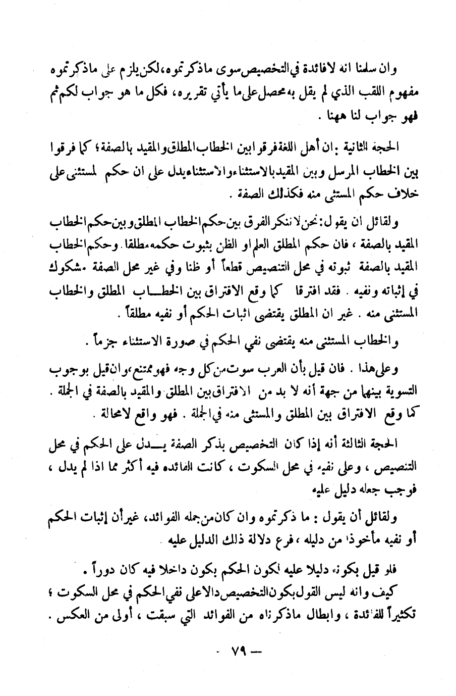 وَلِقَائِلٍ أَنْ يَقُولَ: نَحْنُ لَا نُنْكِرُ الْفَرْقَ بَيْنَ حُكْمِ الْخِطَابِ الْمُطْلَقِ وَبَيْنَ حُكْمِ الْخِطَابِ الْمُقَيَّدِ بِالصِّفَةِ، فَإِنَّ حُكْمَ الْمُطْلَقِ الْعِلْمُ أَوِ الظَّنُّ بِثُبُوتِ حُكْمِهِ مُطْلَقًا، وَحُكْمَ الْخِطَابِ الْمُقَيَّدَ بِالصِّفَةِ ثُبُوتُهُ فِي مَحَلِّ التَّنْصِيصِ قَطْعًا أَوْ ظَنًّا، وَفِي غَيْرِ مَحَلِّ الصِّفَةِ مَشْكُوكٌ فِي إِثْبَاتِهِ وَنَفْيِهِ فَقَدِ افْتَرَقَا كَمَا وَقَعَ الِافْتِرَاقُ بَيْنَ الْخِطَابِ الْمُطْلَقِ وَالْخِطَابِ الْمُسْتَثْنَى مِنْهُ غَيْرَ أَنَّ الْمُطْلَقَ يَقْتَضِي إِثْبَاتَ الْحُكْمِ أَوْ نَفْيَهُ مُطْلَقًا، وَالْخِطَابُ الْمُسْتَثْنَى مِنْهُ يَقْتَضِي نَفْيَ الْحُكْمِ فِي صُورَةِ الِاسْتِثْنَاءِ جَزْمًا.