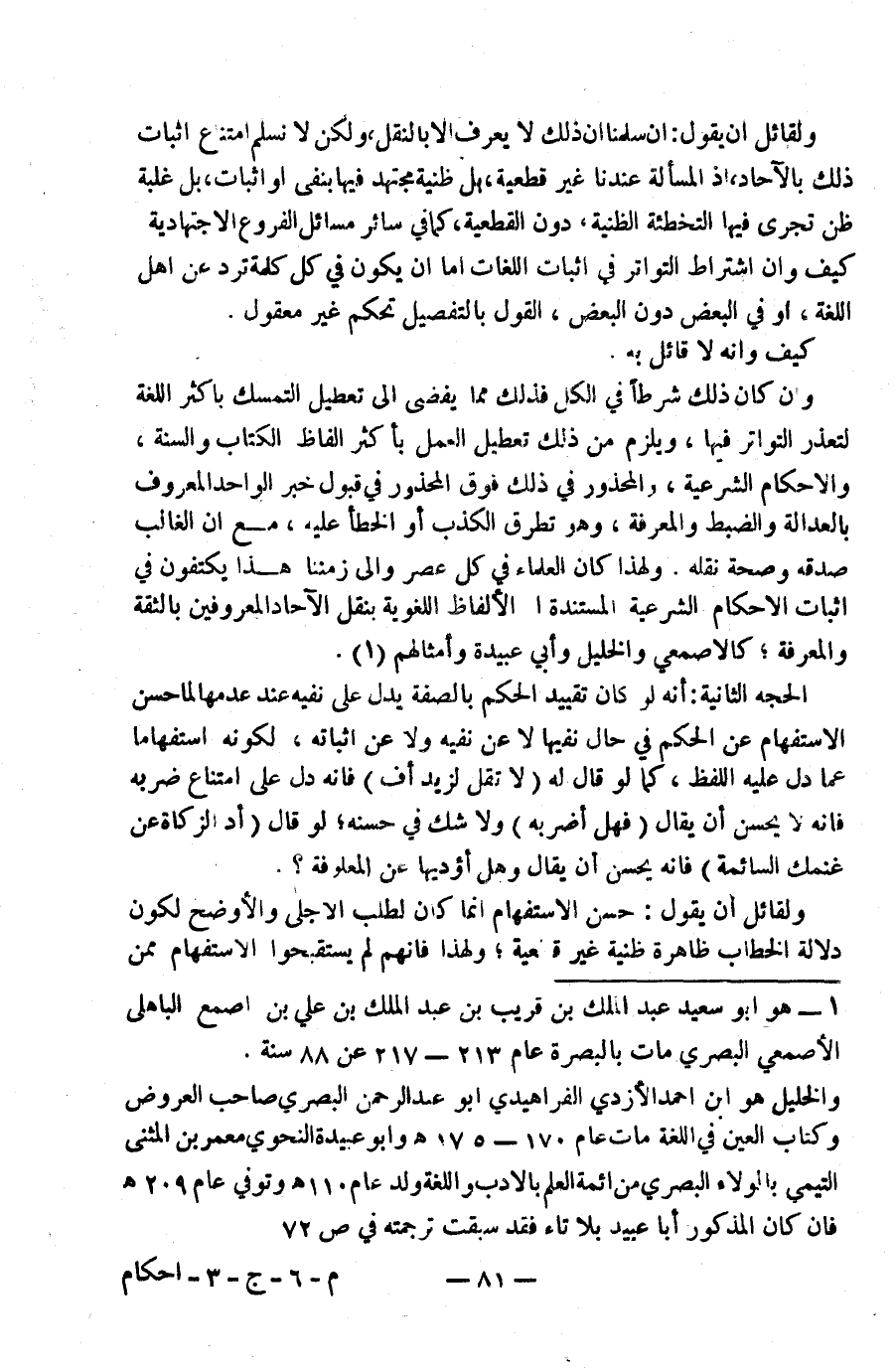 وَلِهَذَا كَانَ الْعُلَمَاءُ فِي كُلِّ عَصْرٍ وَإِلَى زَمَنِنَا هَذَا يَكْتَفُونَ فِي إِثْبَاتِ الْأَحْكَامِ الشَّرْعِيَّةِ الْمُسْتَنِدَةِ إِلَى الْأَلْفَاظِ اللُّغَوِيَّةِ بِنَقْلِ الْآحَادِ الْمَعْرُوفِينَ بِالثِّقَةِ وَالْمَعْرِفَةِ كَالْأَصْمَعِيِّ وَالْخَلِيلِ وَأَبِي عُبَيْدَةَ وَأَمْثَالِهِمْ. (١) الْحُجَّةُ الثَّانِيَةُ: أَنَّهُ لَوْ كَانَ تَقْيِيدُ الْحُكْمِ بِالصِّفَةِ يَدُلُّ عَلَى نَفْيِهِ عِنْدَ عَدَمِهَا لَمَا حَسُنَ الِاسْتِفْهَامُ عَنِ الْحُكْمِ فِي حَالِ نَفْيِهَا لَا عَنْ نَفْيِهِ وَلَا عَنْ إِثْبَاتِهِ، لِكَوْنِهِ اسْتِفْهَامًا عَمَّا دَلَّ عَلَيْهِ اللَّفْظُ، كَمَا لَوْ قَالَ لَهُ: " لَا تَقُلْ لِزَيْدٍ أُفٍّ " فَإِنَّهُ دَلَّ عَلَى امْتِنَاعِ ضَرْبِهِ فَإِنَّهُ لَا يَحْسُنُ أَنْ يُقَالَ: " فَهَلْ أَضْرِبُهُ " وَلَا شَكَّ فِي حُسْنِهِ، لَوْ قَالَ: " أَدِّ الزَّكَاةَ عَنْ غَنَمِكَ السَّائِمَةِ " فَإِنَّهُ يَحْسُنُ أَنْ يُقَالَ وَهَلْ أُؤَدِّيهَا عَنِ الْمَعْلُوفَةِ؟