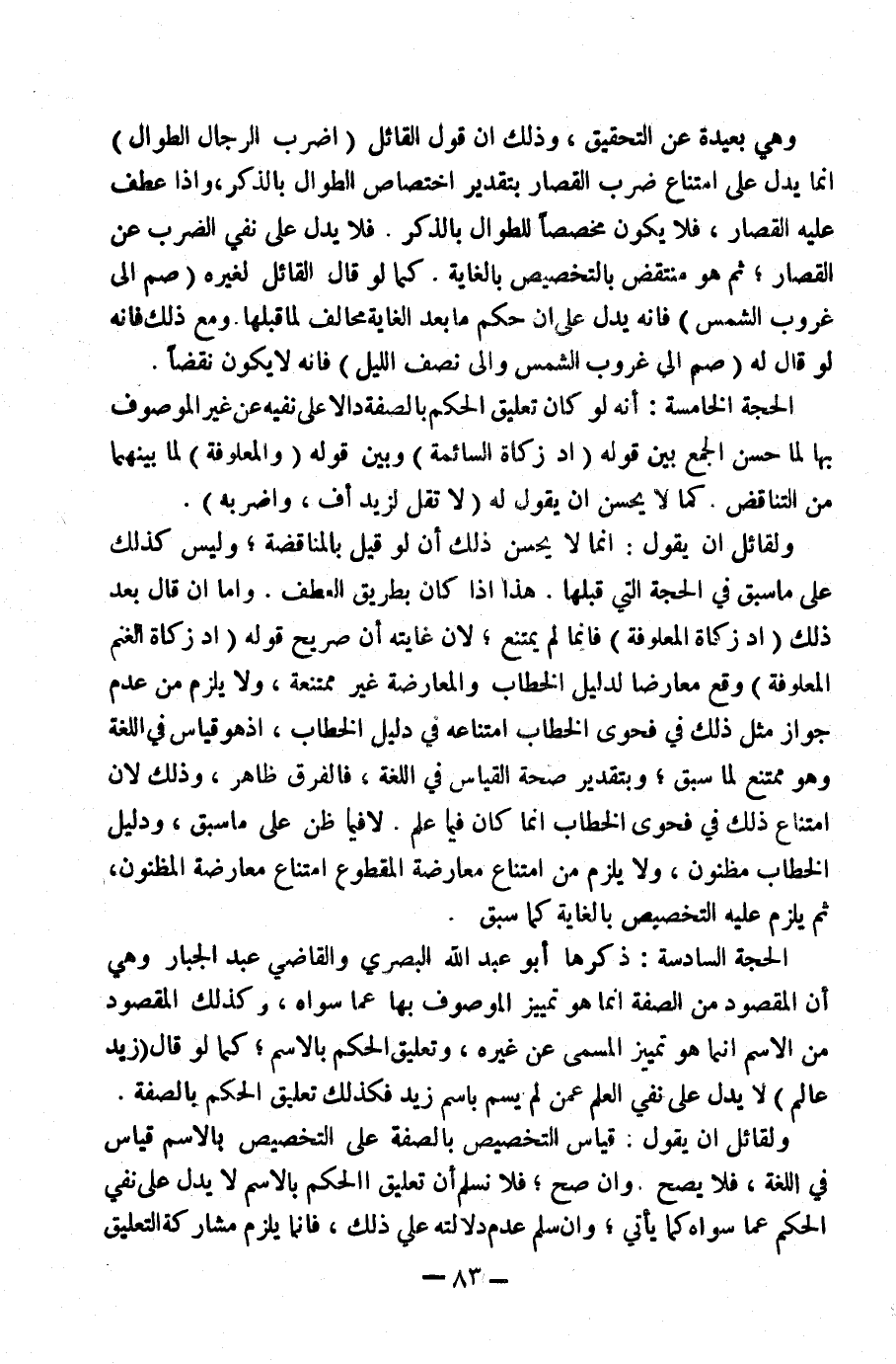 الْحُجَّةُ السَّادِسَةُ: ذَكَرَهَا أَبُو عَبْدِ اللَّهِ الْبَصْرِيُّ وَالْقَاضِي عَبْدُ الْجَبَّارِ، وَهِيَ أَنَّ الْمَقْصُودَ مِنَ الصِّفَةِ إِنَّمَا هُوَ تَمْيِيزُ الْمَوْصُوفِ بِهَا عَمَّا سِوَاهُ.