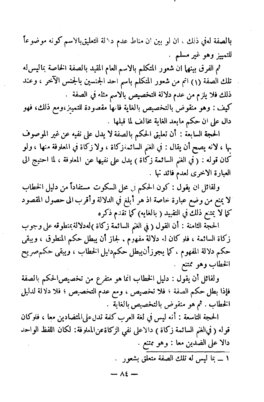 الْحُجَّةُ السَّابِعَةُ: أَنَّ تَعْلِيقَ الْحُكْمِ بِالصِّفَةِ لَا يَدُلُّ عَلَى نَفْيِهِ عَنْ غَيْرِ الْمَوْصُوفِ بِهَا، لِأَنَّهُ يَصِحُّ أَنْ يُقَالَ: فِي الْغَنَمِ السَّائِمَةِ زَكَاةٌ، وَلَا زَكَاةَ فِي الْمَعْلُوفَةِ مِنْهَا، وَلَوْ كَانَ قَوْلُهُ: " «فِي الْغَنَمِ السَّائِمَةِ زَكَاةٌ» " يَدُلُّ عَلَى نَفْيِهَا عَنِ الْمَعْلُوفَةِ لَمَا احْتِيجَ إِلَى الْعِبَارَةِ الْأُخْرَى لِعَدَمِ فَائِدَتِهَا.
