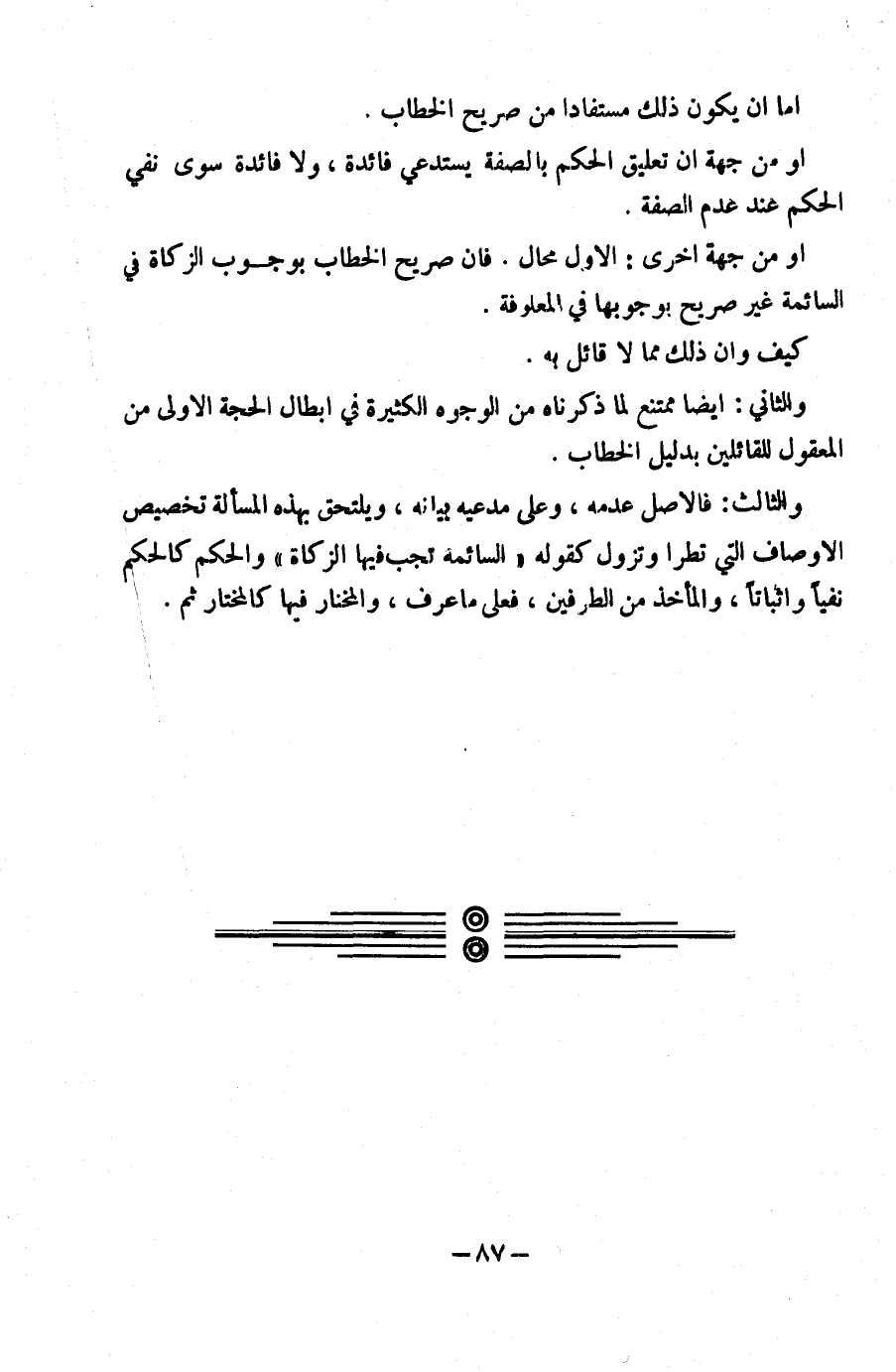 إِمَّا أَنْ يَكُونَ ذَلِكَ مُسْتَفَادًا مِنْ صَرِيحِ الْخِطَابِ، أَوْ مِنْ جِهَةِ أَنَّ تَعْلِيقَ الْحُكْمِ بِالصِّفَةِ يَسْتَدْعِي فَائِدَةً، وَلَا فَائِدَةَ سِوَى نَفْيِ الْحُكْمِ عِنْدَ عَدَمِ الصِّفَةِ، أَوْ مِنْ جِهَةٍ أُخْرَى: الْأَوَّلُ مُحَالٌ، فَإِنَّ صَرِيحَ الْخِطَابِ بِوُجُوبِ الزَّكَاةِ فِي السَّائِمَةِ غَيْرُ صَرِيحٍ بِوُجُوبِهَا فِي الْمَعْلُوفَةِ كَيْفَ وَإِنَّ ذَلِكَ مِمَّا لَا قَائِلَ بِهِ.