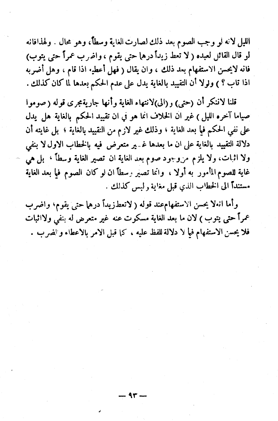 قُلْنَا لَا نُنْكِرُ أَنَّ (حَتَّى) وَ (إِلَى) لِانْتِهَاءِ الْغَايَةِ وَأَنَّهَا جَارِيَةٌ مَجْرَى قَوْلِهِ: " «صُومُوا صِيَامًا آخِرُهُ اللَّيْلُ» " غَيْرَ أَنَّ الْخِلَافَ إِنَّمَا هُوَ فِي أَنَّ تَقْيِيدَ الْحُكْمِ بِالْغَايَةِ هَلْ يَدُلُّ عَلَى نَفْيِ الْحُكْمِ فِيمَا بَعْدَ الْغَايَةِ، وَذَلِكَ غَيْرُ لَازِمٍ مِنَ التَّقْيِيدِ بِالْغَايَةِ، بَلْ غَايَتُهُ أَنَّ دَلَالَةَ التَّقْيِيدِ بِالْغَايَةِ عَلَى أَنَّ مَا بَعْدَهَا غَيْرُ مُتَعَرَّضٍ فِيهِ بِالْخِطَابِ الْأَوَّلِ لَا بِنَفْيٍ وَلَا إِثْبَاتٍ، وَلَا يَلْزَمُ مِنْ وُجُودِ صَوْمٍ بَعْدَ الْغَايَةِ أَنْ تَصِيرَ الْغَايَةُ وَسَطًا، بَلْ هِيَ غَايَةٌ لِلصَّوْمِ الْمَأْمُورِ بِهِ أَوَّلًا، وَإِنَّمَا تَصِيرُ وَسَطًا أَنْ لَوْ كَانَ الصَّوْمُ فِيمَا بَعْدَ الْغَايَةِ مُسْتَنِدًا إِلَى الْخِطَابِ الَّذِي قَبْلَ الْغَايَةِ وَلَيْسَ كَذَلِكَ.