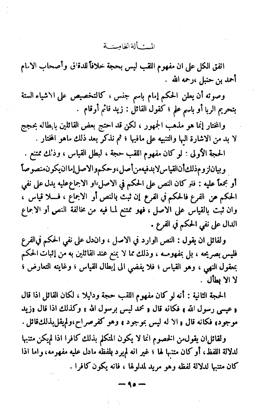 [الْمَسْأَلَةُ الخامسة مَفْهُومَ اللَّقَبِ لَيْسَ بِحُجَّةٍ]