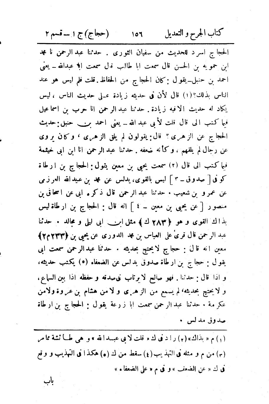 حَدثنا عَبد الرَّحمن، أَخبَرنا حرب بن إِسماعيل، فيما كَتَبَ إلَيَّ، قال: قلت لأَبي عَبد الله، يَعني أَحمد بن حَنبل: حديث الحجاج عن الزُّهْريّ؟ قال: يقولون لم يلق الزُّهْري، وكان يروي عن رجال لم يلقهم، وكأَنه ضعفه.
