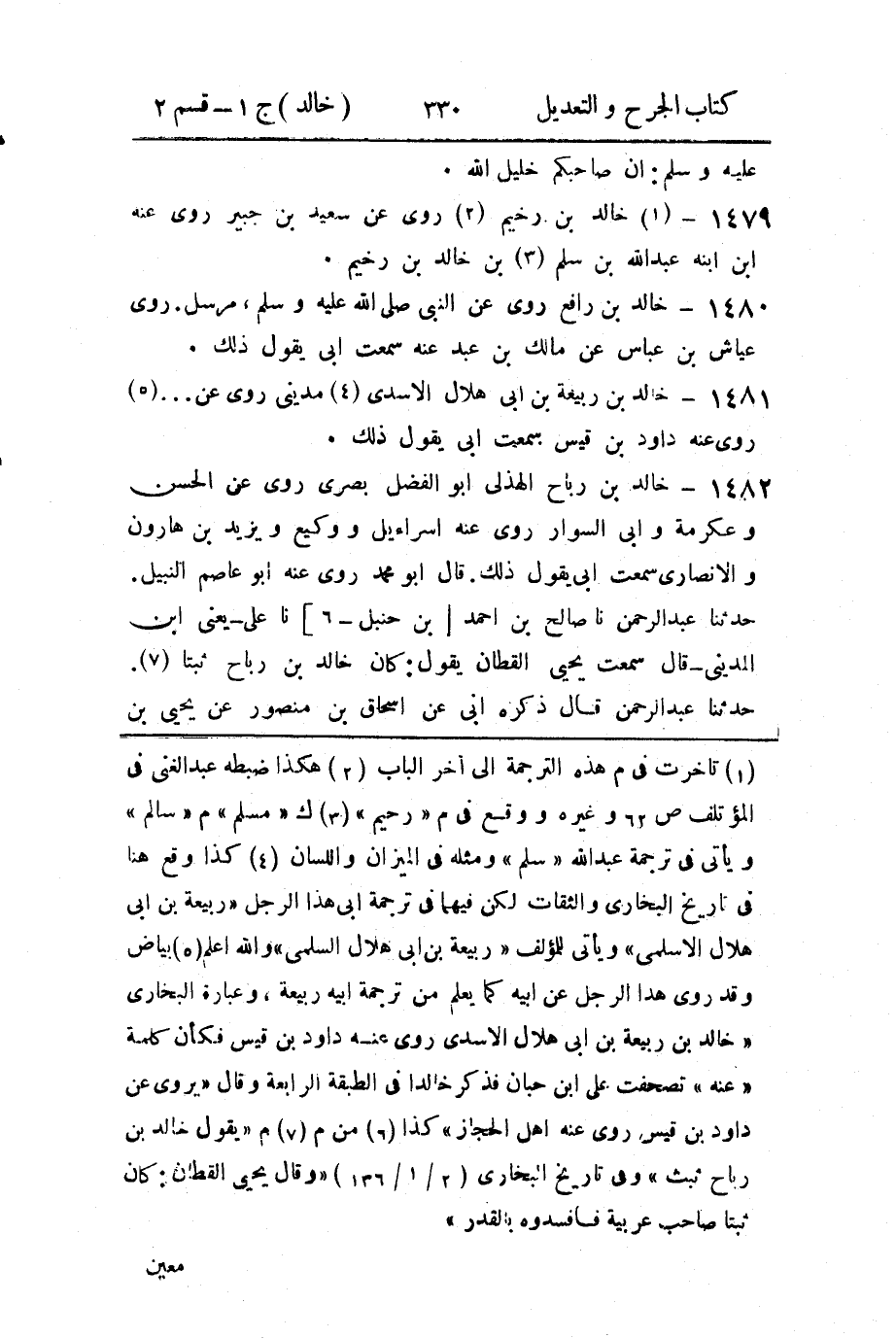 حَدثنا عَبد الرَّحمن، حَدثنا صالح بن أَحمد بن حَنبل، حَدثنا علي، يَعني ابن المَديني، قال: سَمِعتُ يَحيَى القطان يقول: كان خالد بن رباح ثبتا.