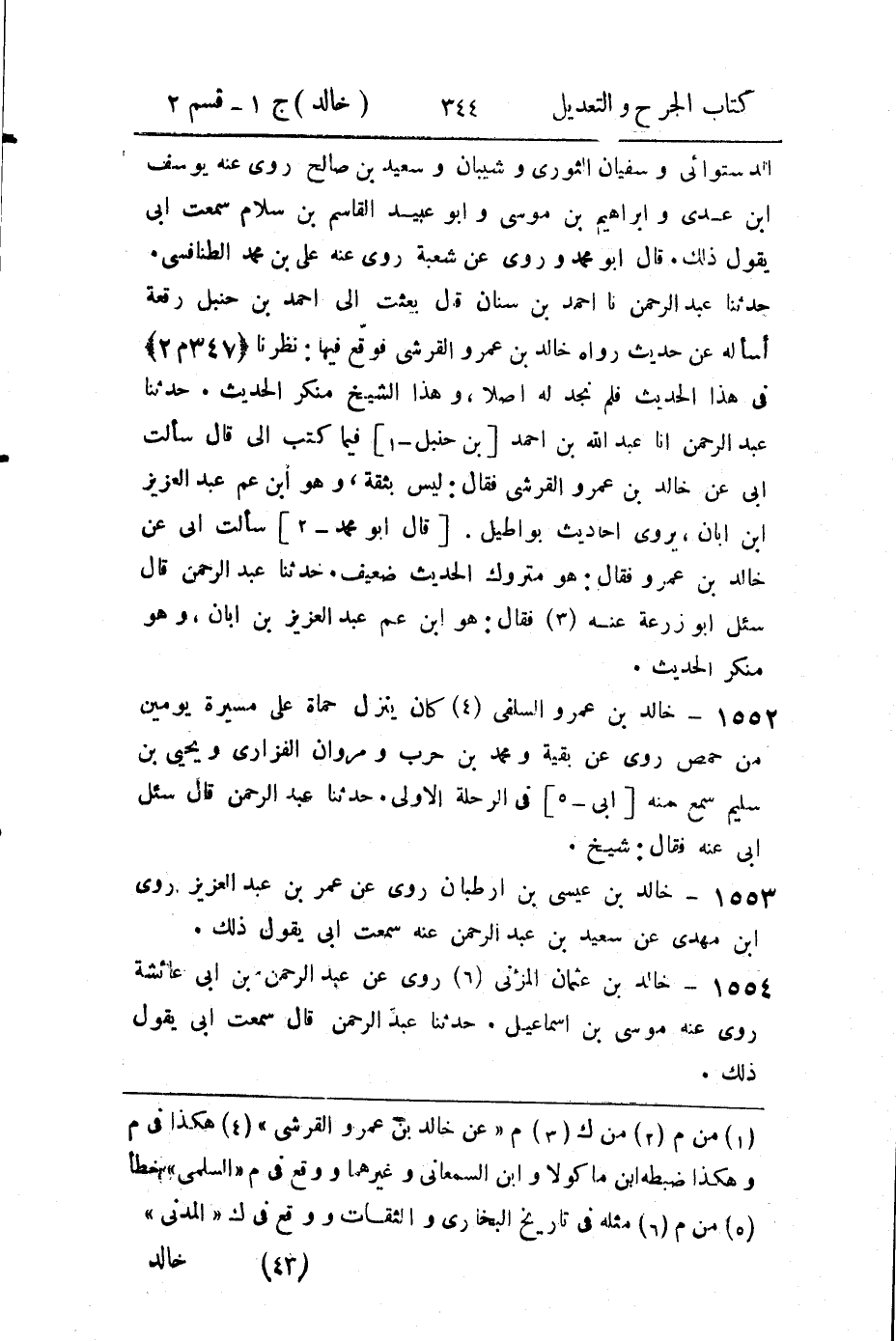 حَدثنا عَبد الرَّحمن، حَدثنا أَحمد بن سنان قال: بعثت إلى أَحمد بن حَنبل رقعة، أسأله عن حديث رواه خالد بن عَمرو القُرَشي، فوقع فيها: نظرنا في هذا الحديث فلم نجد له أصلا، وهذا الشيخ مُنكَر الحديث.