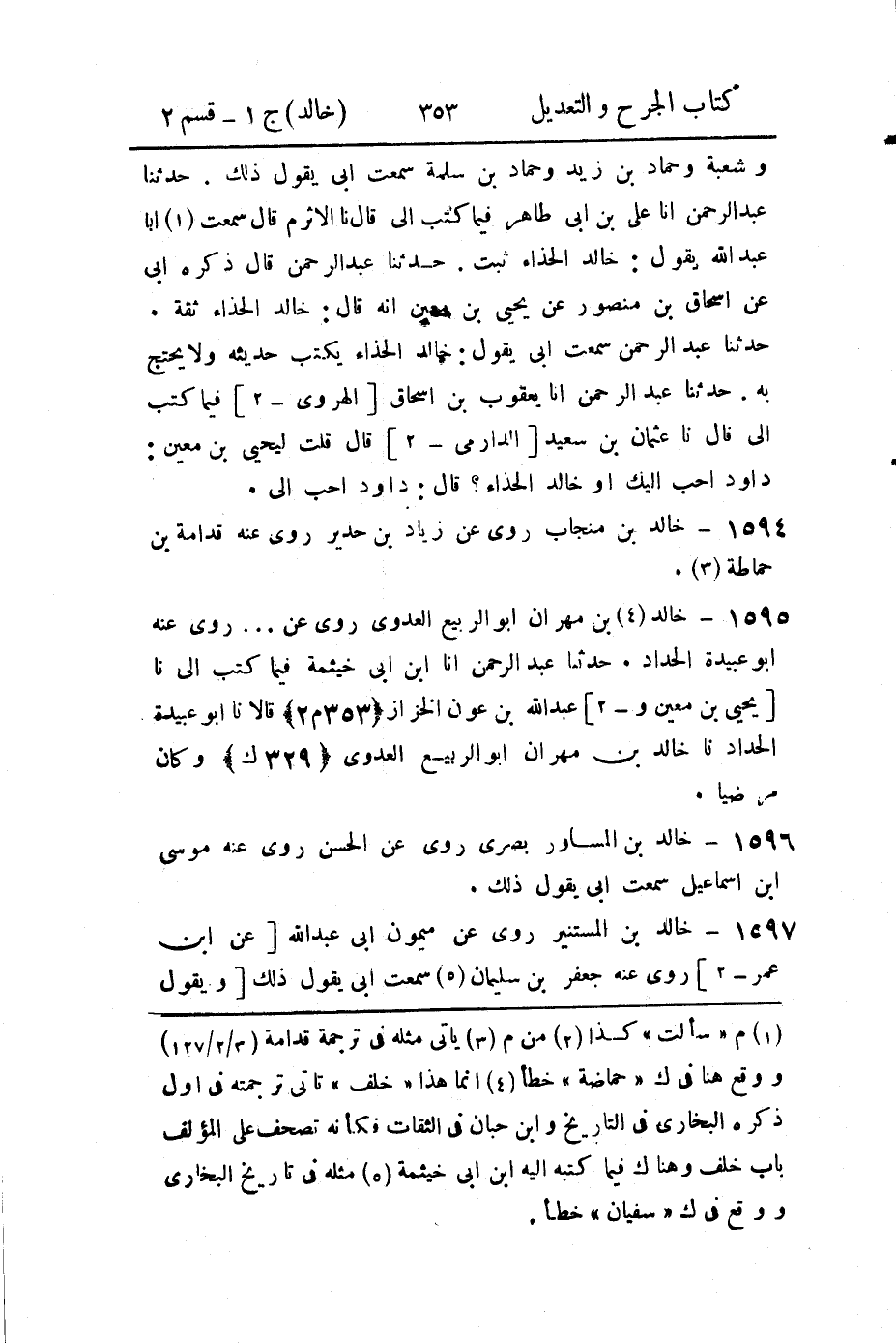 حَدثنا عَبد الرَّحمن، أَخبَرنا يعقوب بن إِسحاق الهروي، فيما كَتَبَ إلَيَّ، قال: حَدثنا عثمان بن سَعيد الدارمي، قال: قلتُ ليحيى بن مَعين: داود أَحَب إليك، أَو خالد الحَذَّاء؟ قال: داود أَحَبُّ إِلَيَّ.