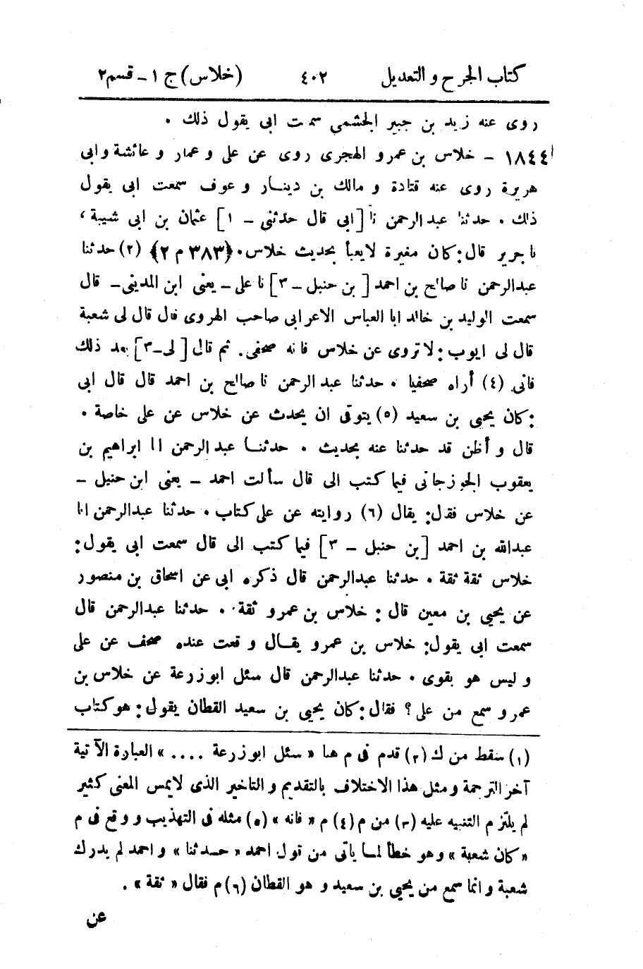 حَدثنا عَبد الرَّحمن، حَدثنا صالح بن أَحمد بن حَنبل، حَدثنا علي، يَعني ابن المَديني، قال: سَمِعتُ الوليد بن خالد أَبَا العباس الأعرابي صاحب الهروي، قال: قال لي شُعبة: قال لي أَيوب: لا تروي عن خلاس، فإِنه صحفي، ثم قال لي بعد ذلك: فإِني أراه صحفيا.