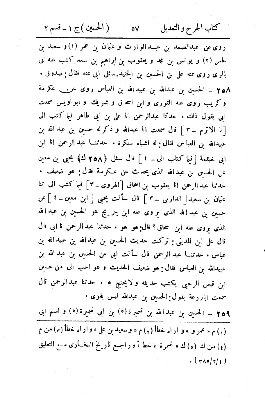 حَدثنا عَبد الرَّحمن، أَخبَرنا يعقوب بن إِسحاق الهروي، فيما كَتَبَ إِلَيَّ، حَدثنا عثمان بن سَعيد الدارمي، قال: سأَلتُ يَحيَى بن مَعين عن حسين بن عَبد الله الذي يروي عنه ابن جُرَيج، هو الحسين بن عَبد الله الذي يروي عنه ابن إِسحاق؟ قال: هو هو.