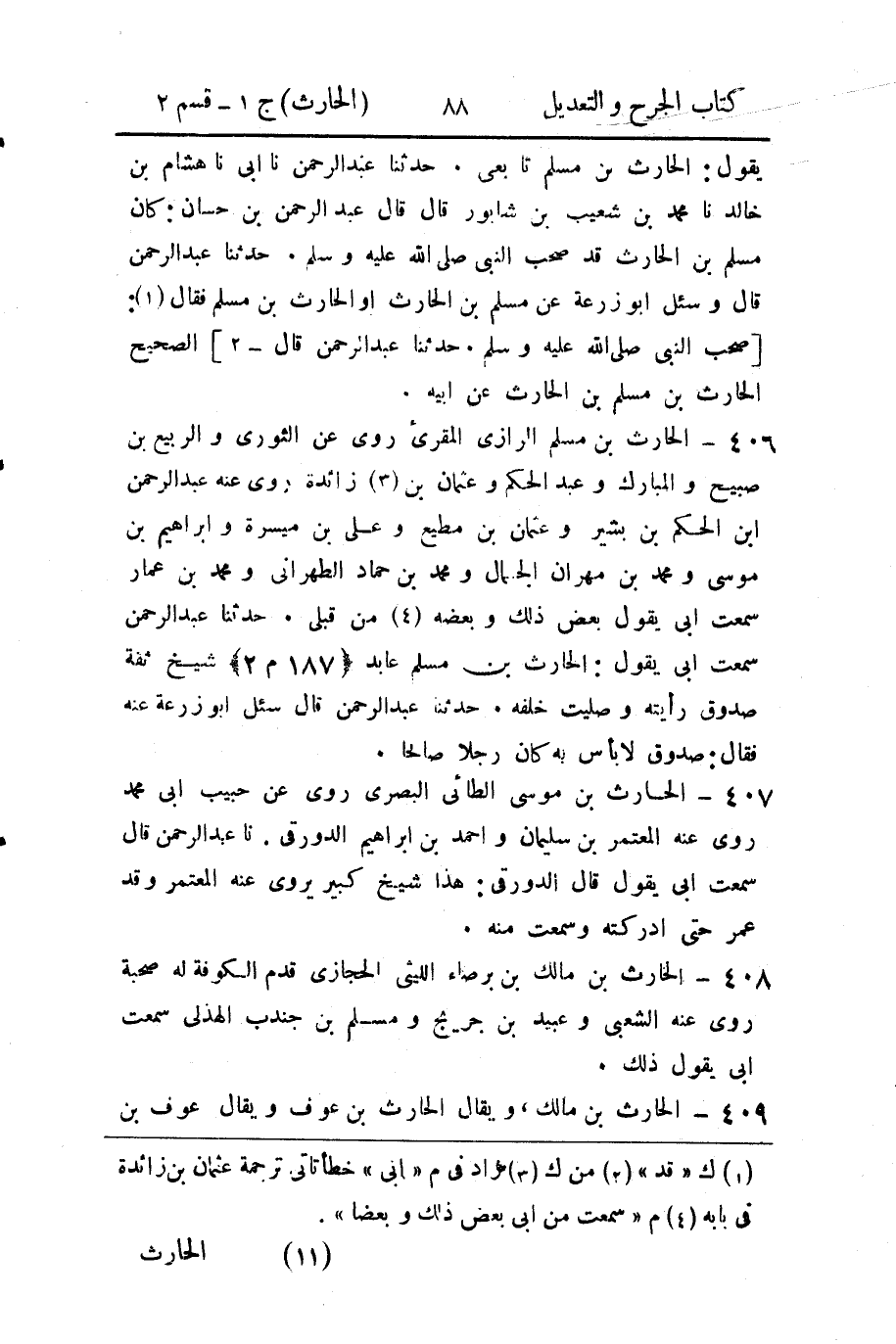 (1) وقع في المطبوع: "حَدثنا عَبد الرَّحمن، قال: وسئل أَبو زُرعَة عن مسلم بن الحارث، أَو الحارث بن مسلم، فقال: [صحب النَّبي صَلى الله عَليه وسَلم، حَدثنا عَبد الرَّحمن، قال]: الصحيح الحارث بن مسلم بن الحارث، عن أَبيه"، أضاف محققه ما بين المعقوفتين عن إحدى النسخ، والصواب حذف ذلك، فهو من سهو الناسخ، إذ شطح بصره فأعاد كتابة آخر الفقرة السابقة، وبداية الفقرة التالية، وقد نقله ابن القطان، عن هذا الموضع، فقال: إنما ذكره ابن أبي حاتم: الحارث بن مسلم بن الحارث، فجعل مسلم بن الحارث هو الذي يروي عن النَّبي صَلى الله عَليه وَسلمَ، ويروي عنه ابنه الحارث، وذكر أَيضا عن أبي زُرْعَة، أنه سئل عن مسلم بن الحارث، أَو الحارث بن مسلم، فقال: الصحيح الحارث بن مسلم بن الحارث، عن أبيه. "بيان الوهم والإيهام" 4/646.