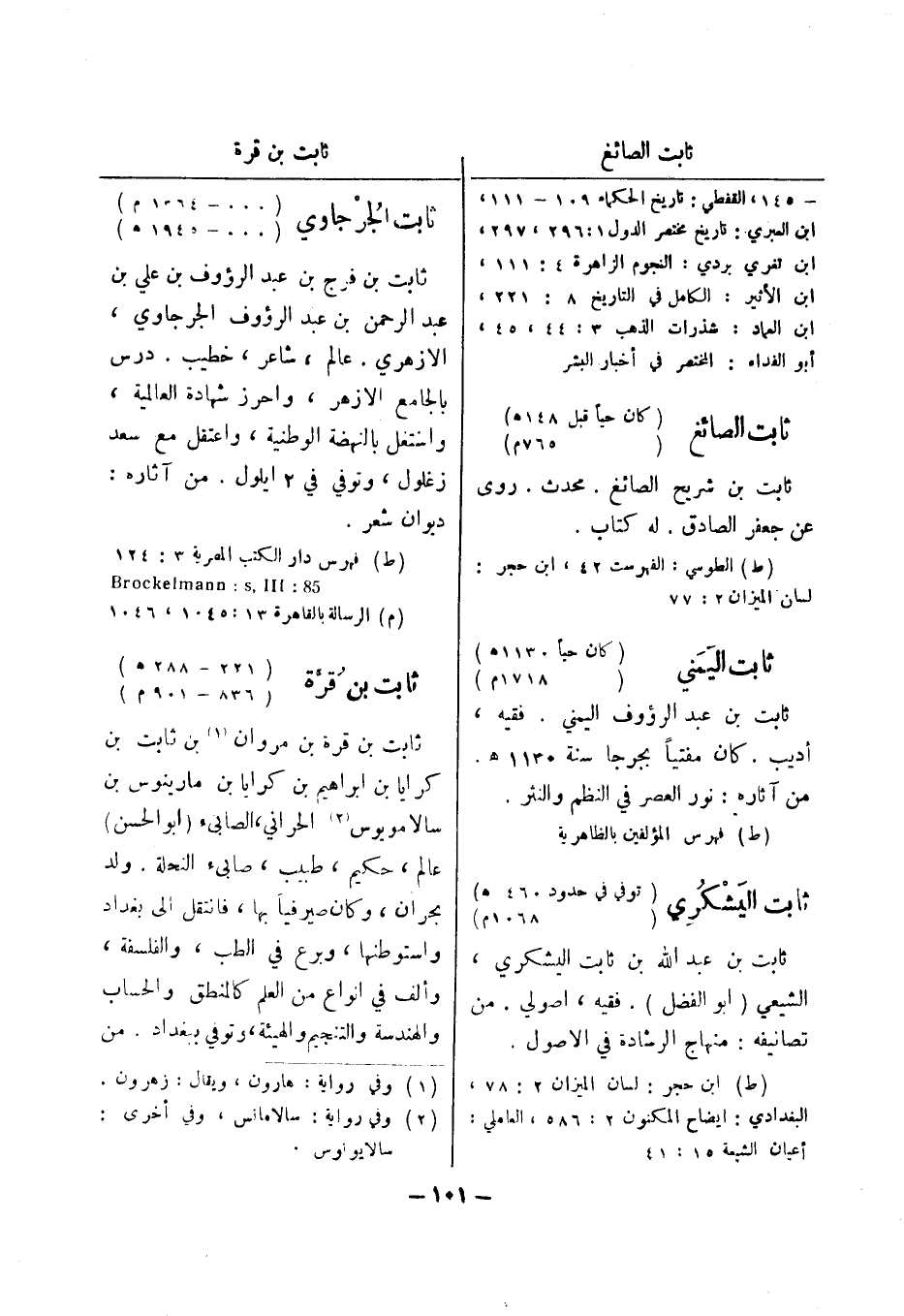 (ط) فهرس دار الكتب المصرية 3: 124 85: Brockelmann: s , III (م) الرسالة بالقاهرة 13: 1045، 1046 ثابت بن قرة (221 - 288 هـ) (836 - 901 م) ثابت بن قرة بن مروان (1) بن ثابت بن كرايا بن ابراهيم بن كرايا بن مارينوس بن