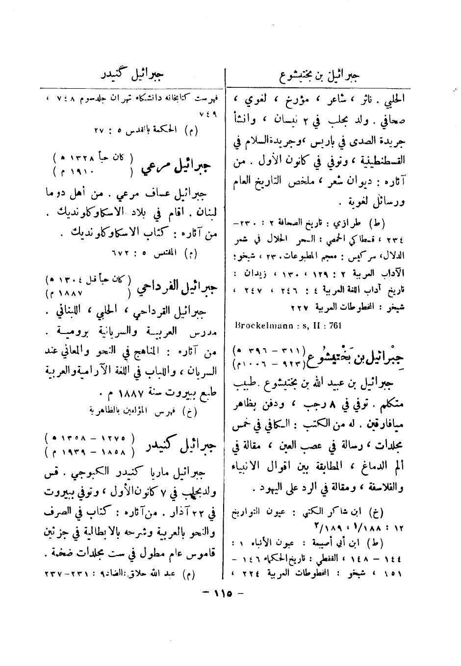 (ط) طرازي: تاريخ الصحافة 2: 230 - 234، قسطاكي الحمصي: السحر الحلال في شعر الدلال، سركيس: معجم المطبوعات 230، شيخو: الآداب العربية 2: 129، 130، زيدان: تاريخ آداب اللغة العربية 4: 246، 247، شيخو: المخطوطات العربية 227 761: Brockelmann: s , II جبرائيل بن بختيشوع (311 - 396 هـ) (923 - 1006 م) جبرائيل بن عبيد الله بن بختيشوع.