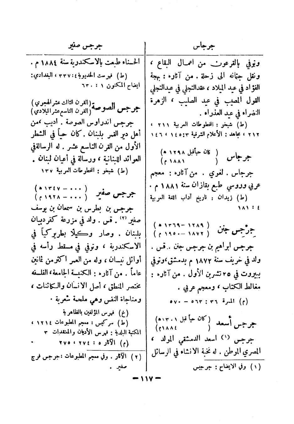 (ط) زيدان: تاريخ آداب اللغة العربية 4: 181 جرجس جنن (1289 - 1369 هـ) (1872 - 1950 م) جرجس ابراهيم بن جرجس جنن.