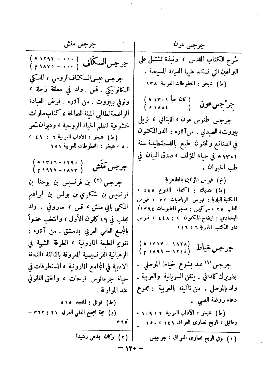(ط) شيخو: المخطوطات العربية 138 جرجس عون (كان حيا 1301 هـ) (1884 م) جرجس طنوس عون، اللبناني، نزيل بيروت، الصيدلي.